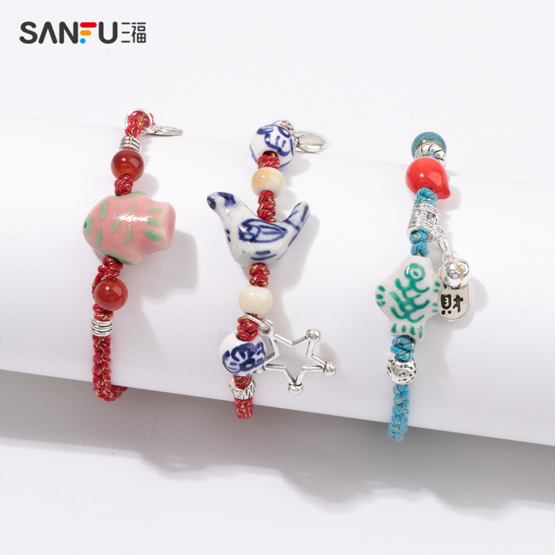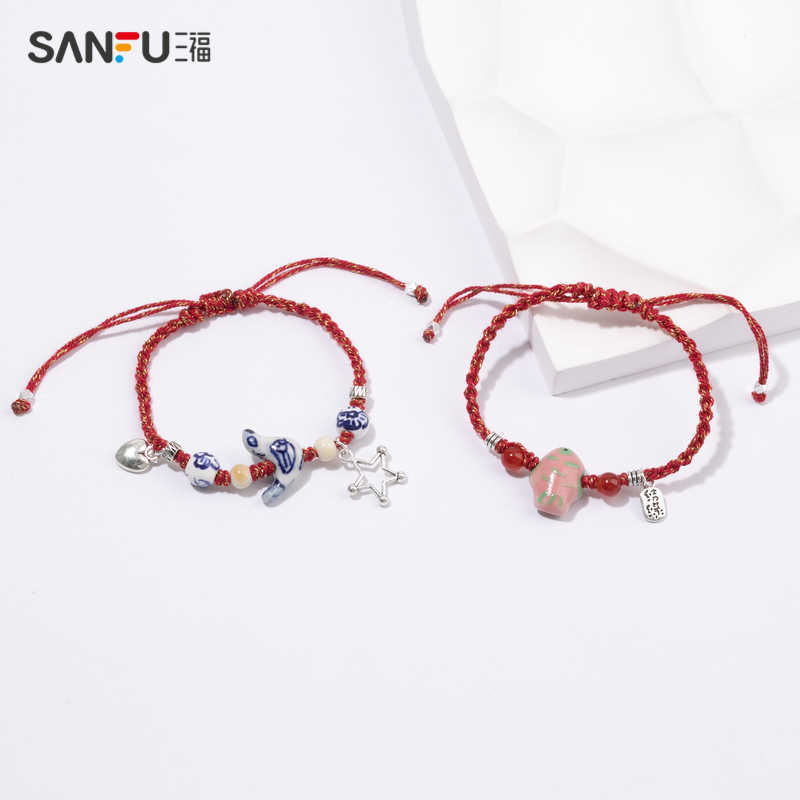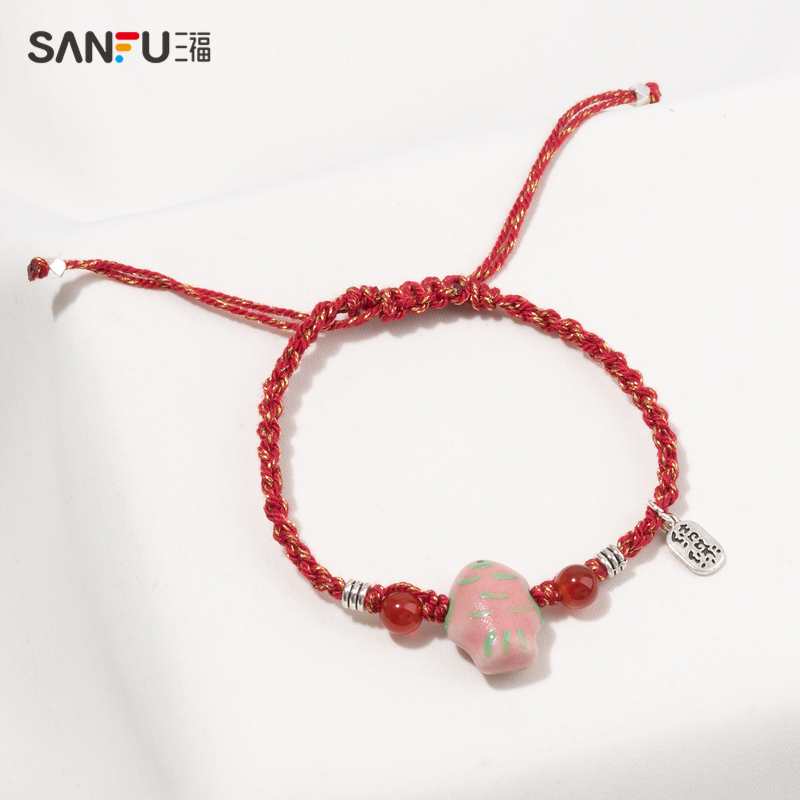三福国潮红绳陶瓷手链单条 时尚气质饰品编织配饰首饰836263