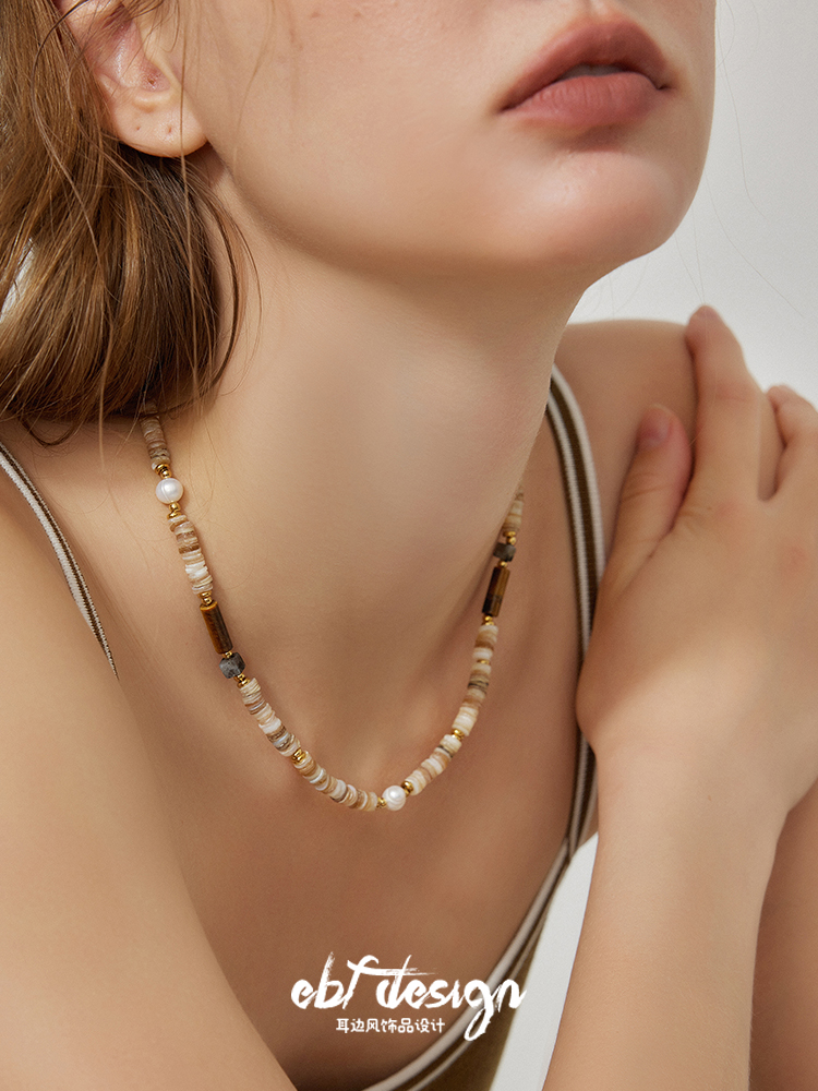 EBFWIND贝壳奶咖 复古气质天然珍珠加天然石串珠美拉德色系项链
