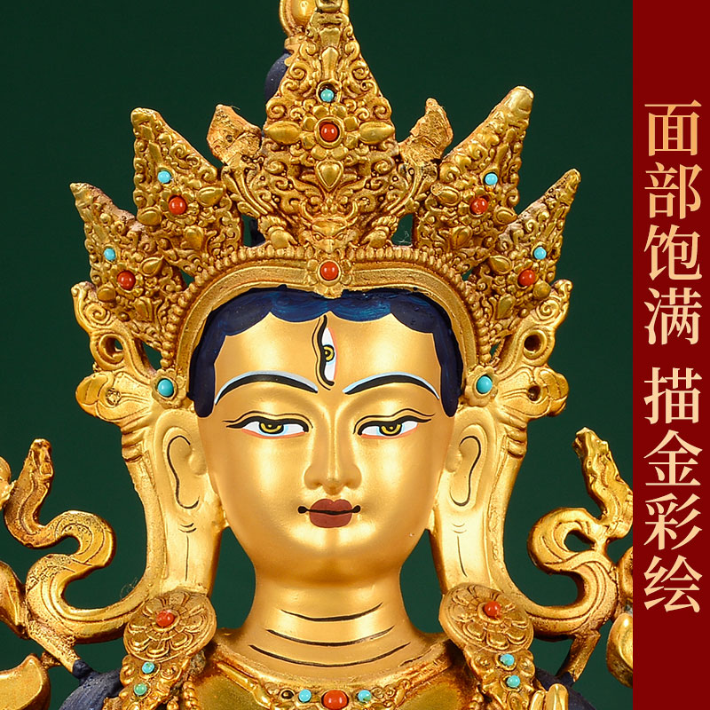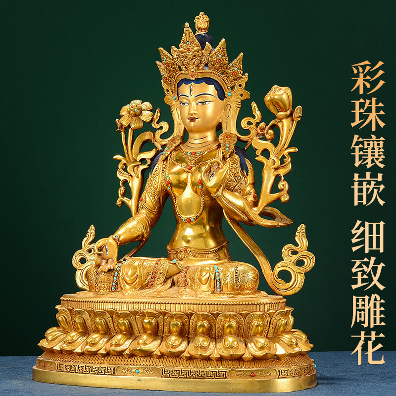 白度母全鎏金镶宝石双层底座铜像居家桌面度母像摆件10寸