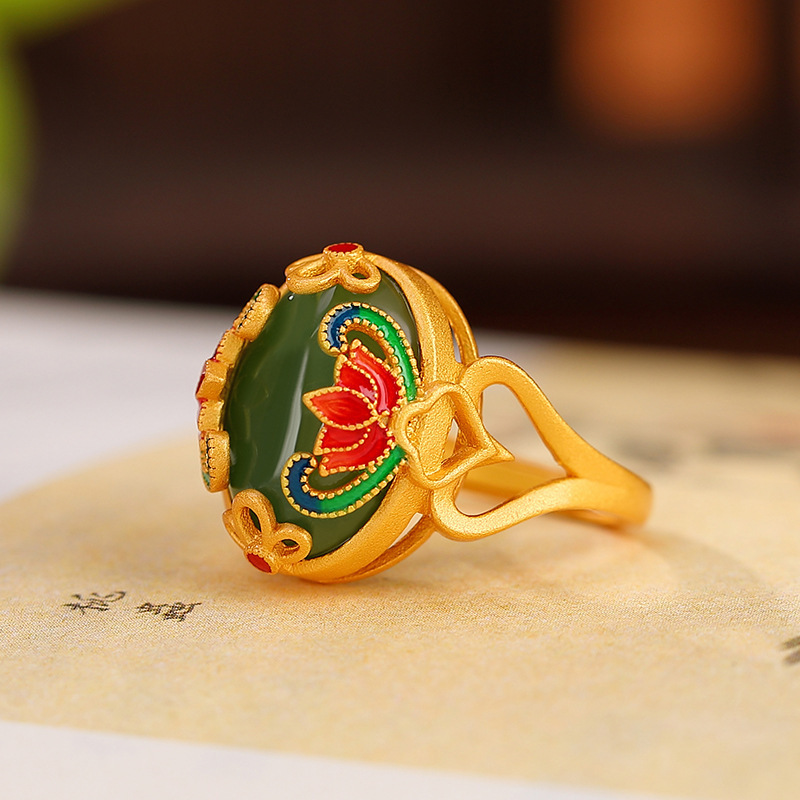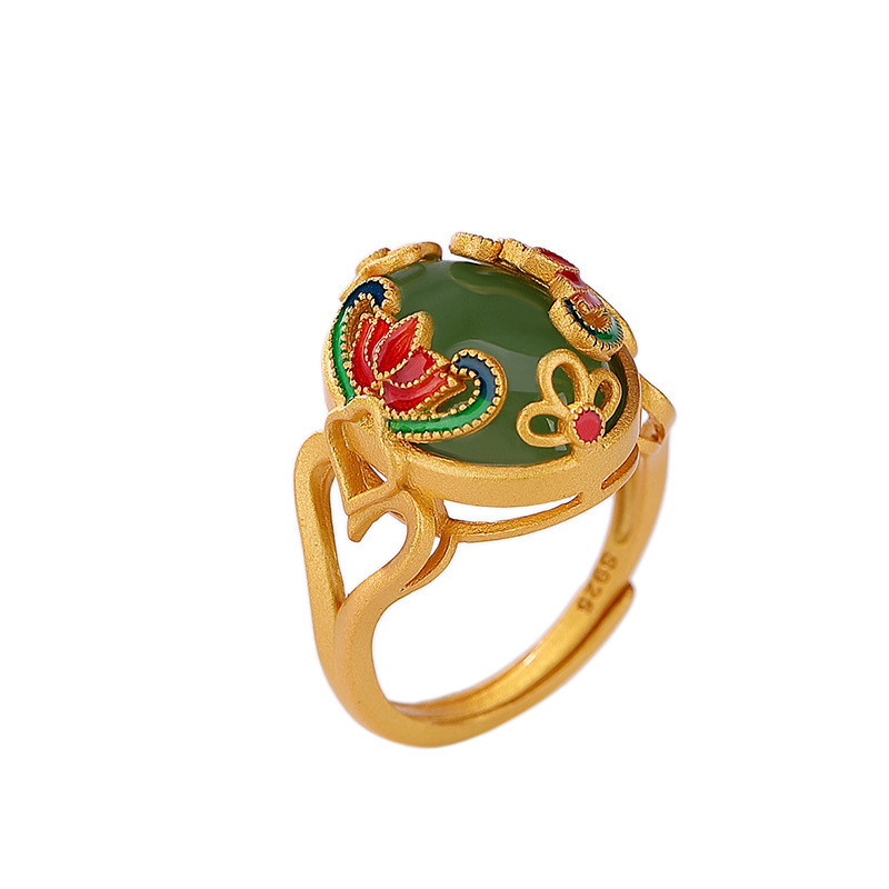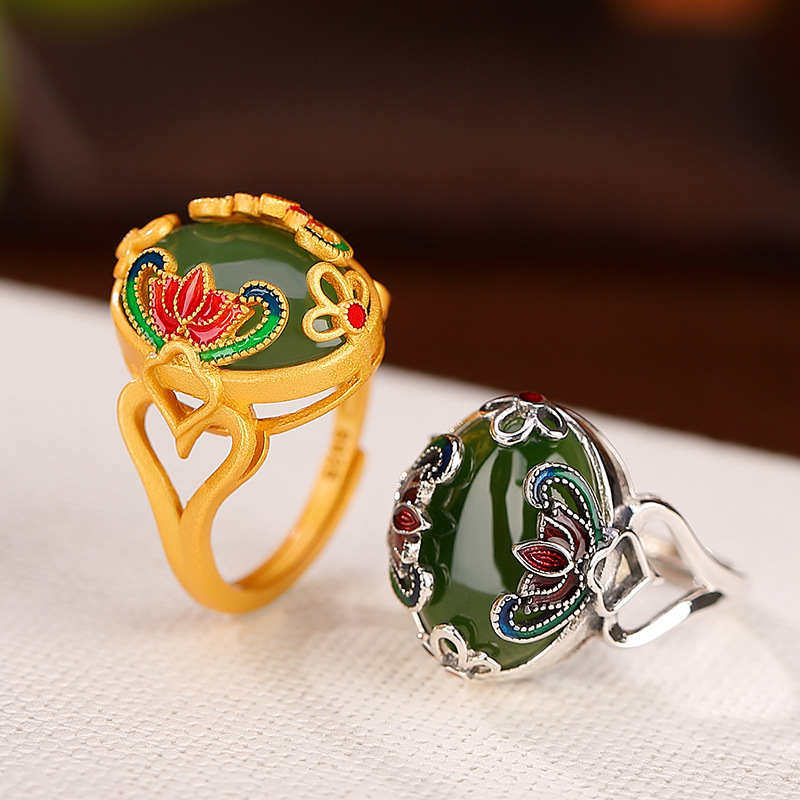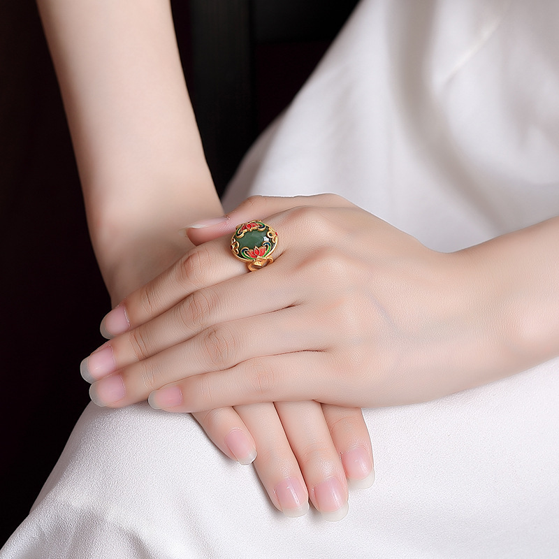 【新年转运】荷花戒指蛋面珐琅如意锁戒指925银镶和田玉蛋面珐琅