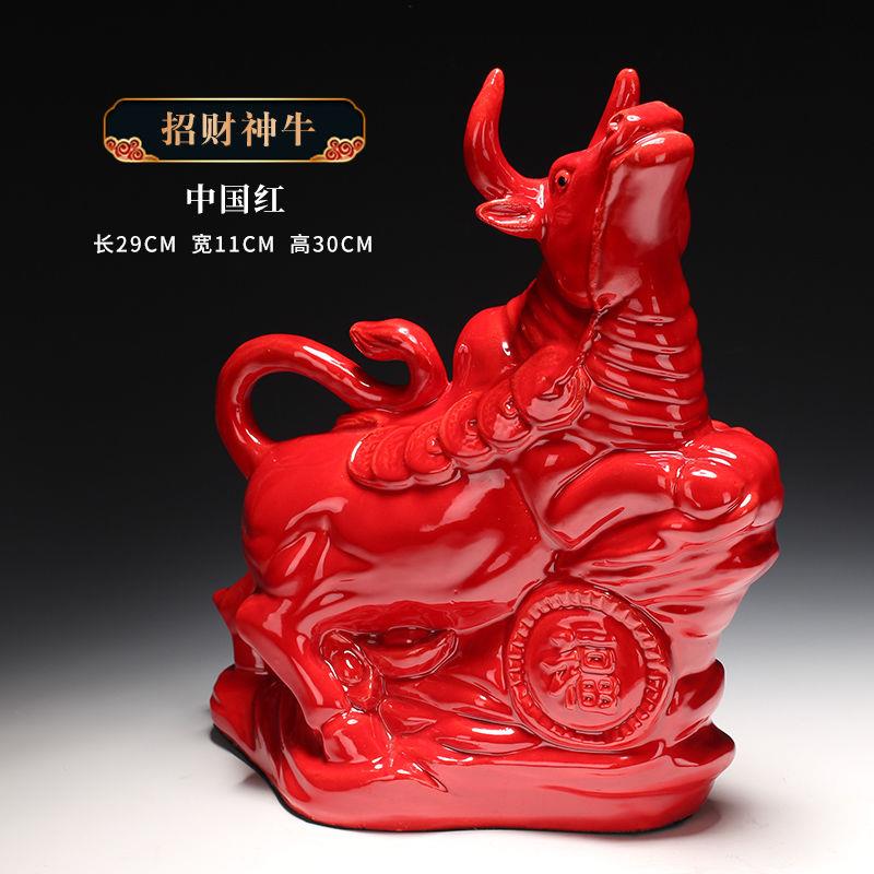 红色牛气冲天牛年吉祥工艺品客厅酒柜博古架装饰品陶瓷工艺牛摆件