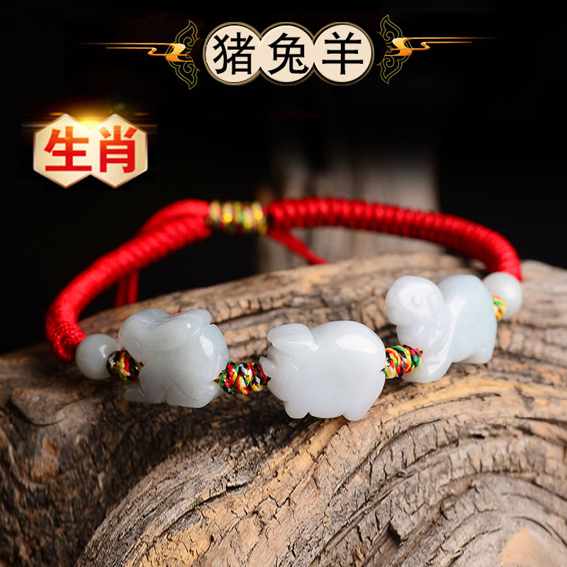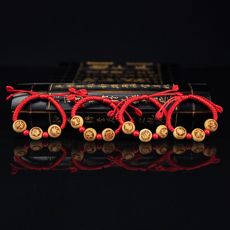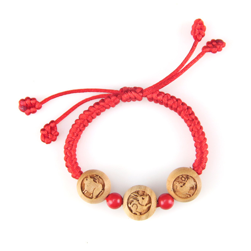 2023年兔年本命年桃木三合红绳手链猪兔羊亥卯未手编调节手串