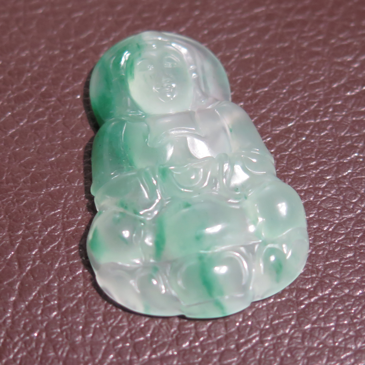 高品质天然非洲翠独龙玉冰种玉石带绿飘花笑佛吊坠S