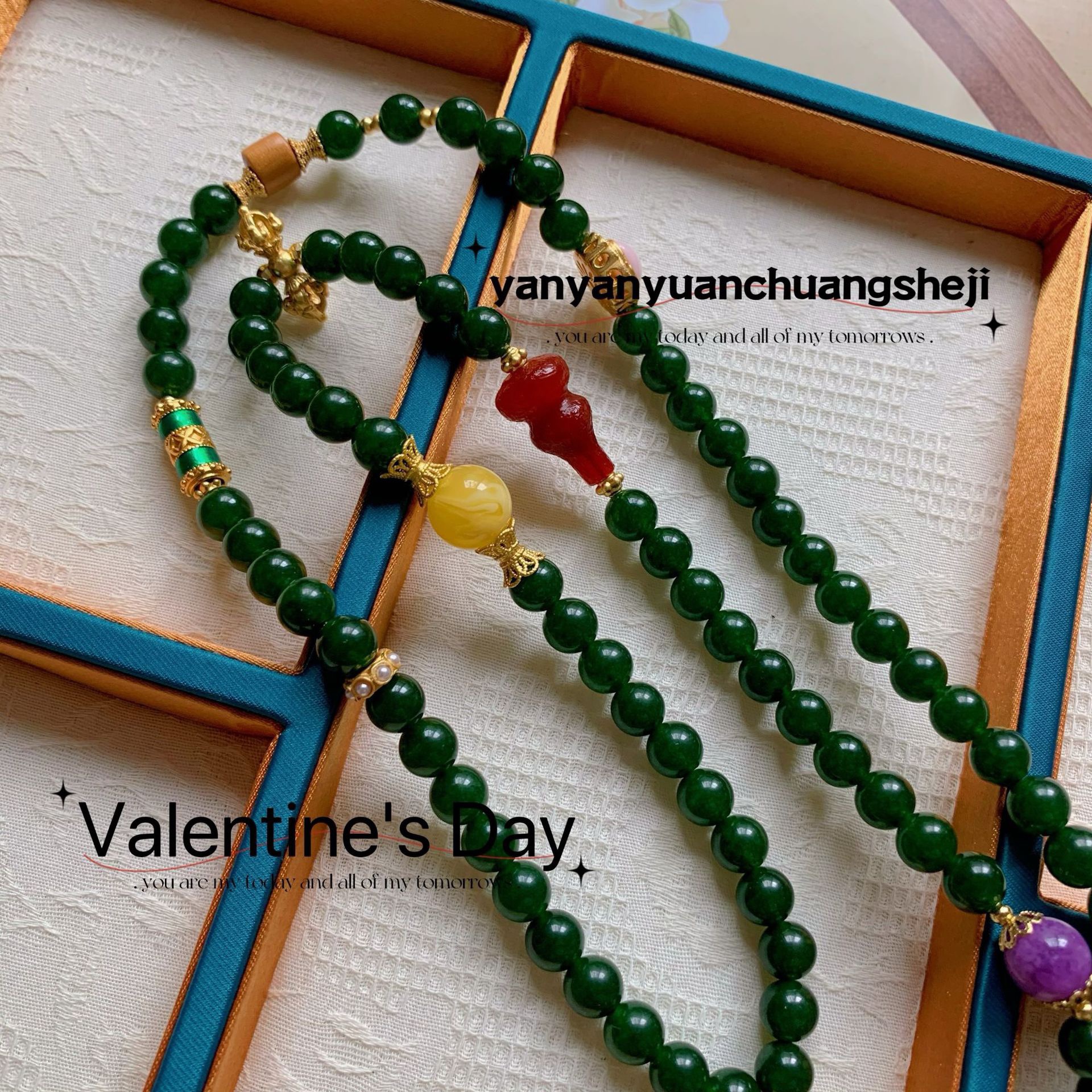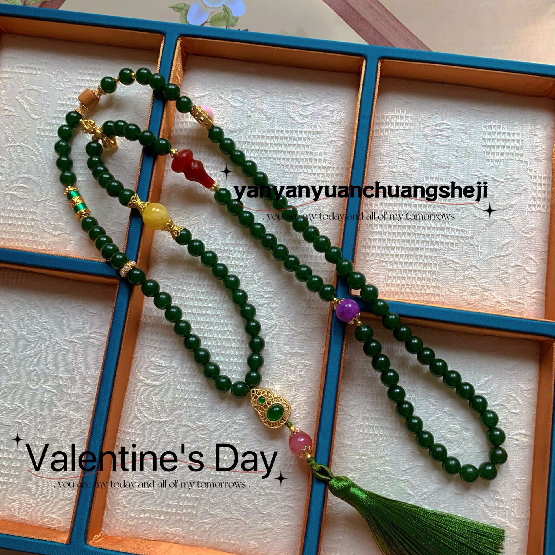 新中式网红小众绿色流苏轻奢手工气质女款多宝葫芦马来玉彩色项链