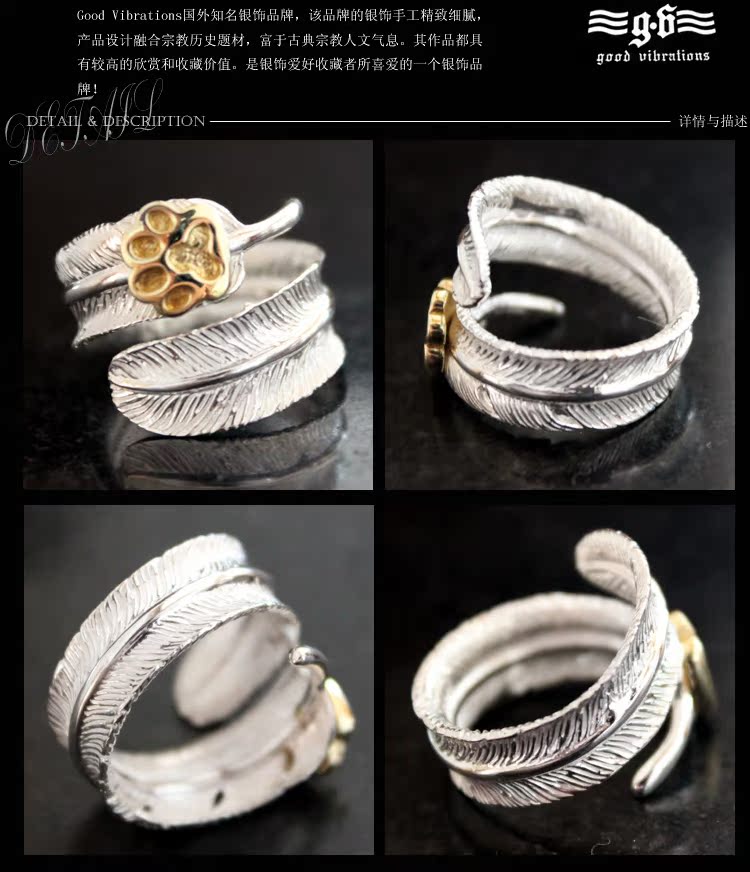 Good Vibrations潮品 印第安羽毛熊掌925纯银戒指男士女开口指环
