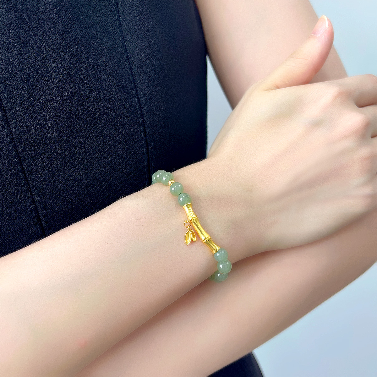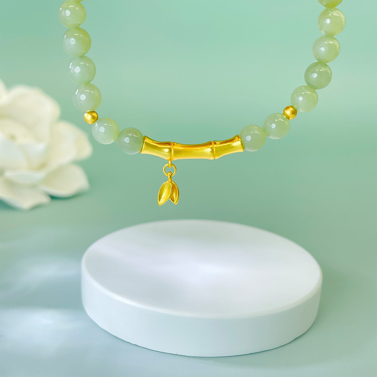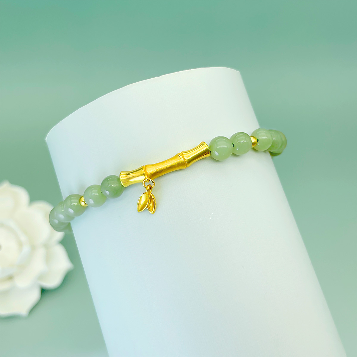 黛慕妮 玉手串竹节莲花两世欢女手链925银金色和田玉串珠礼物饰品