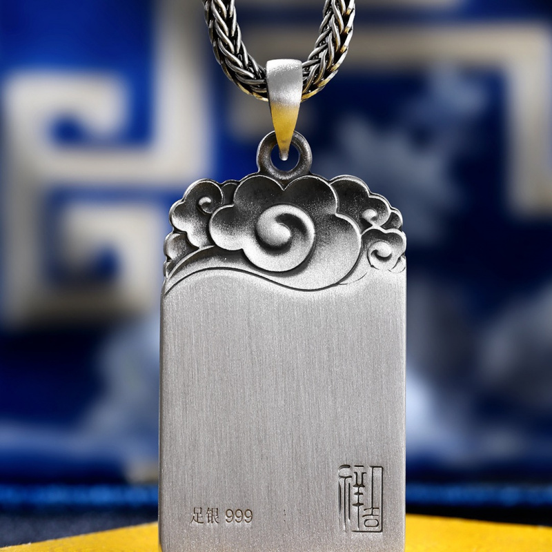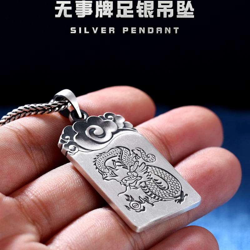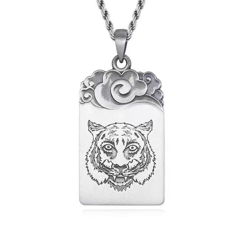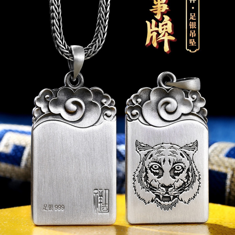 【好运】99足银虎纹平安无事牌男吊坠实心纯银项链男士军牌挂饰毛