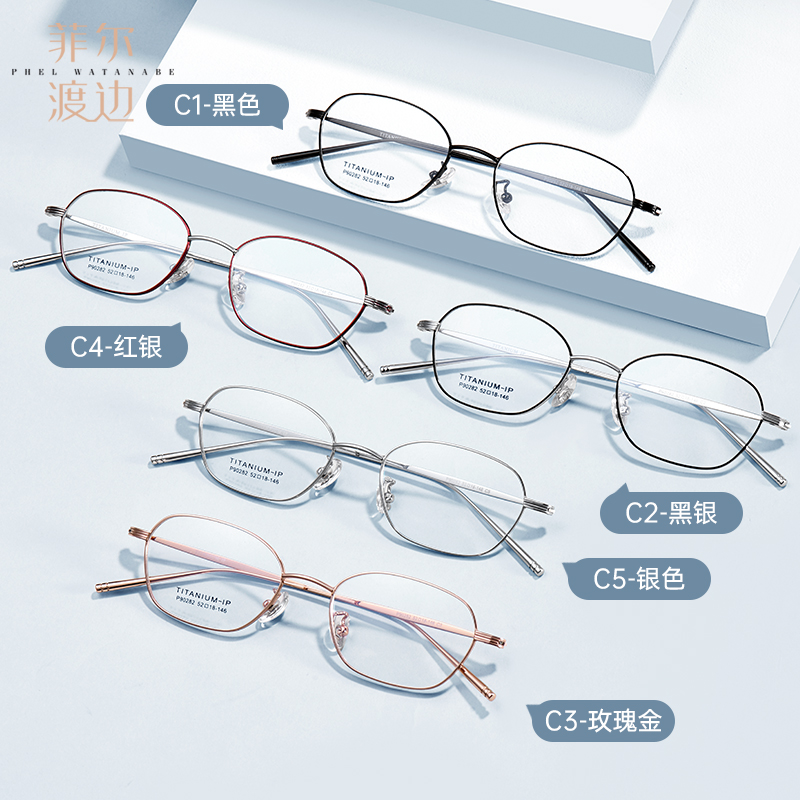 菲尔渡边韩系纯欲钛窄框多边形眼镜女配近视防蓝光圆脸镜架P90282