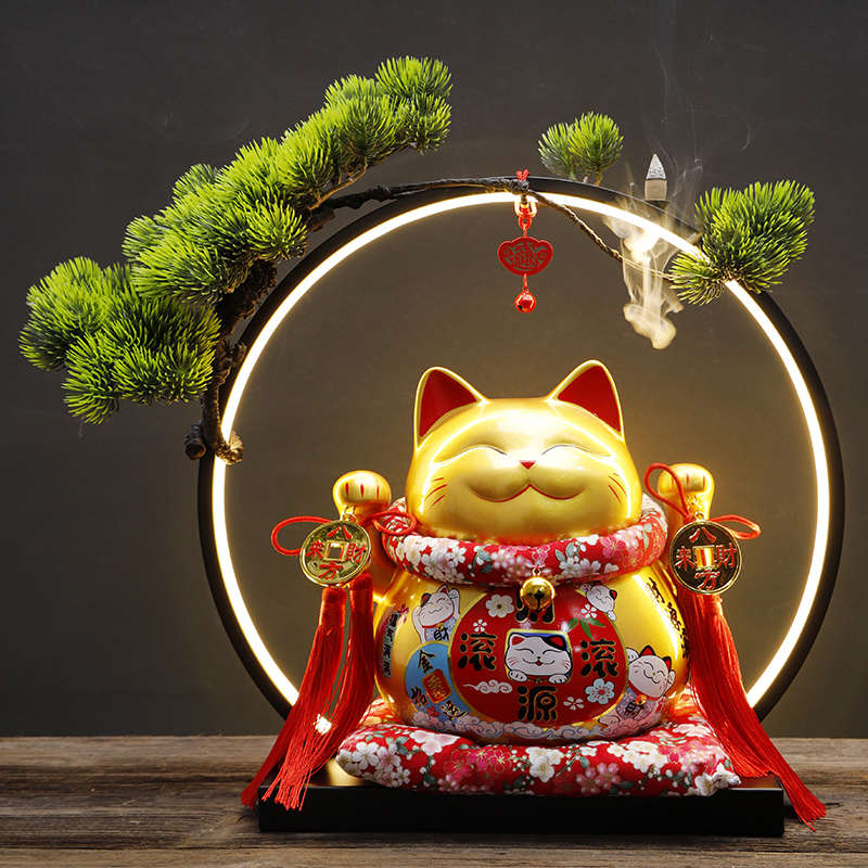 创意猫摆件自动摇手店铺前台收银台家居装饰开业送礼绿植灯圈批发