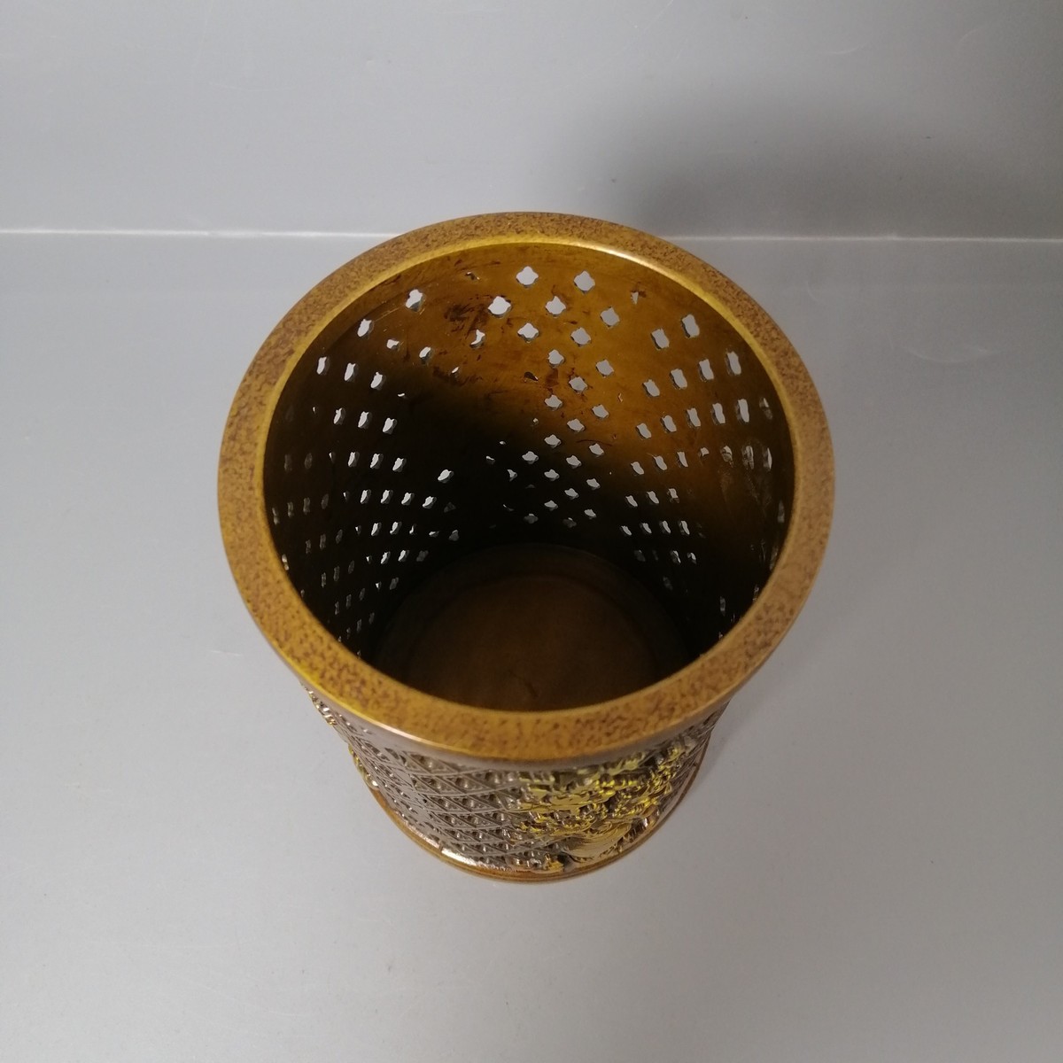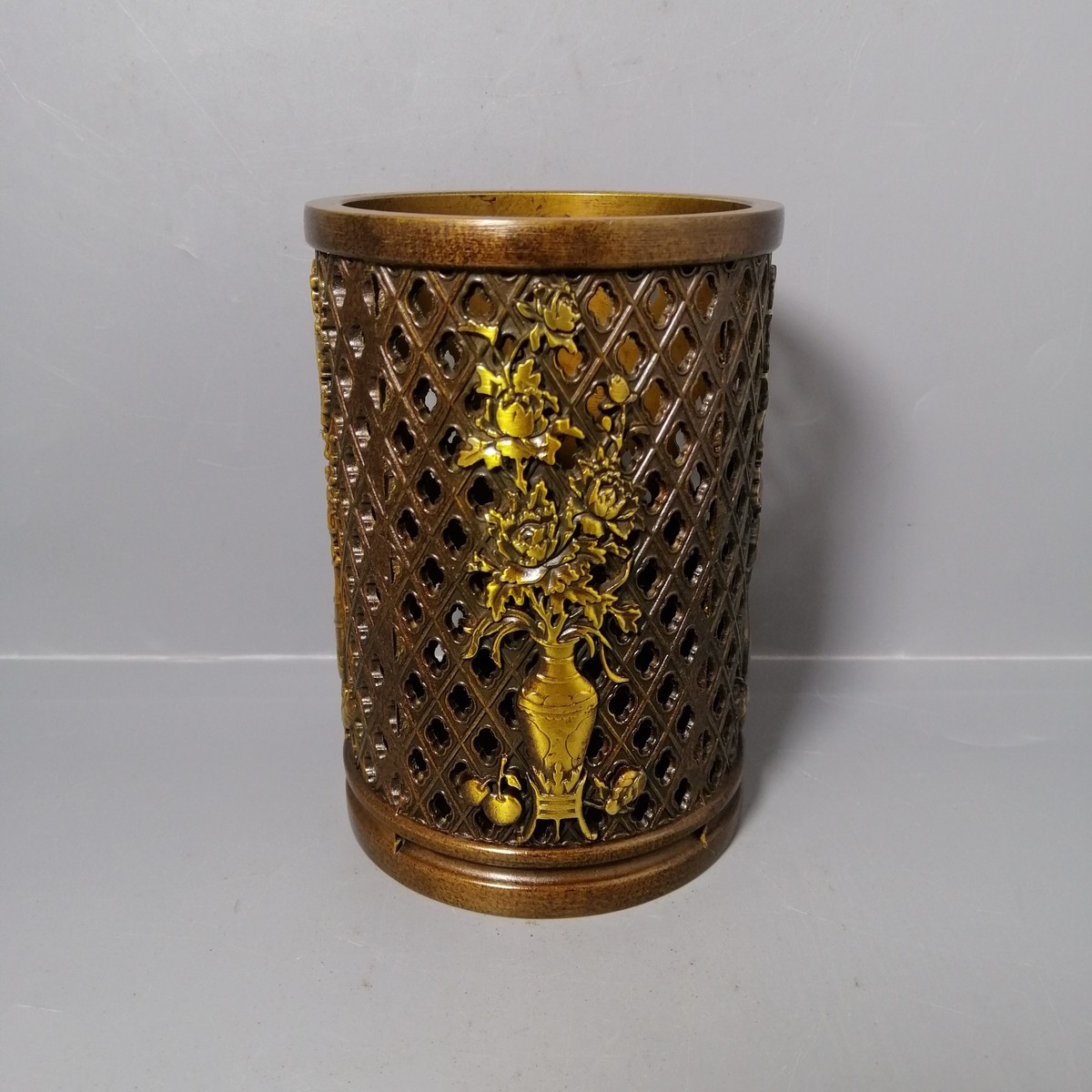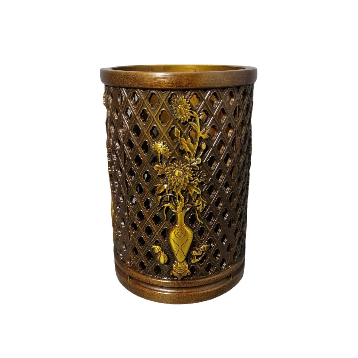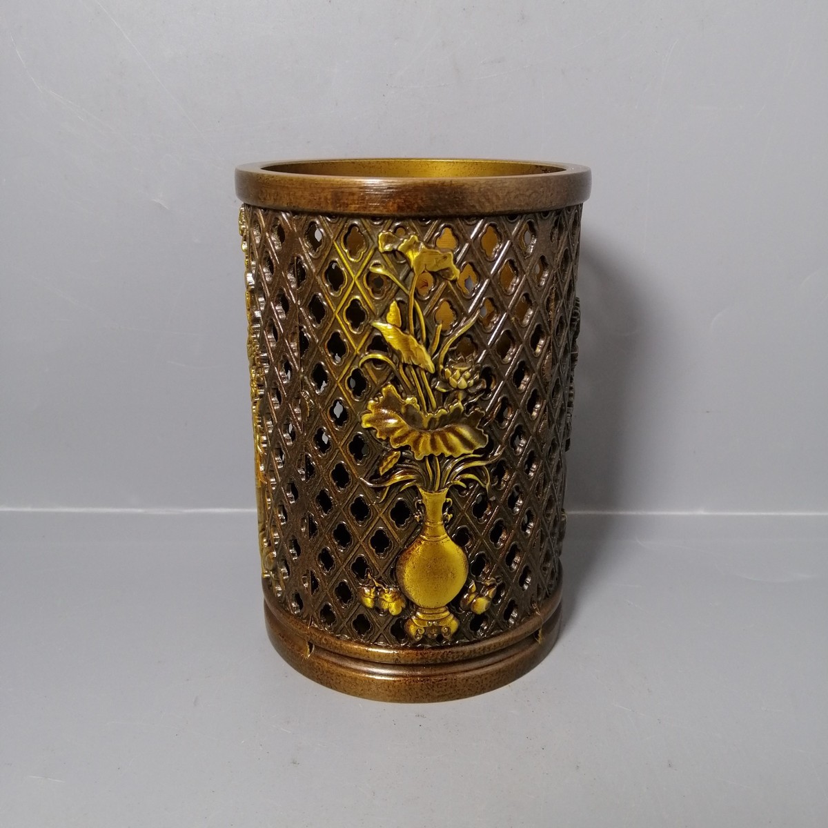 古玩批发仿古铜紫铜鎏金筒笔筒香花开富贵怀旧客厅创意礼品工艺品
