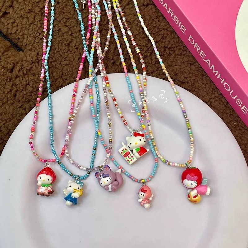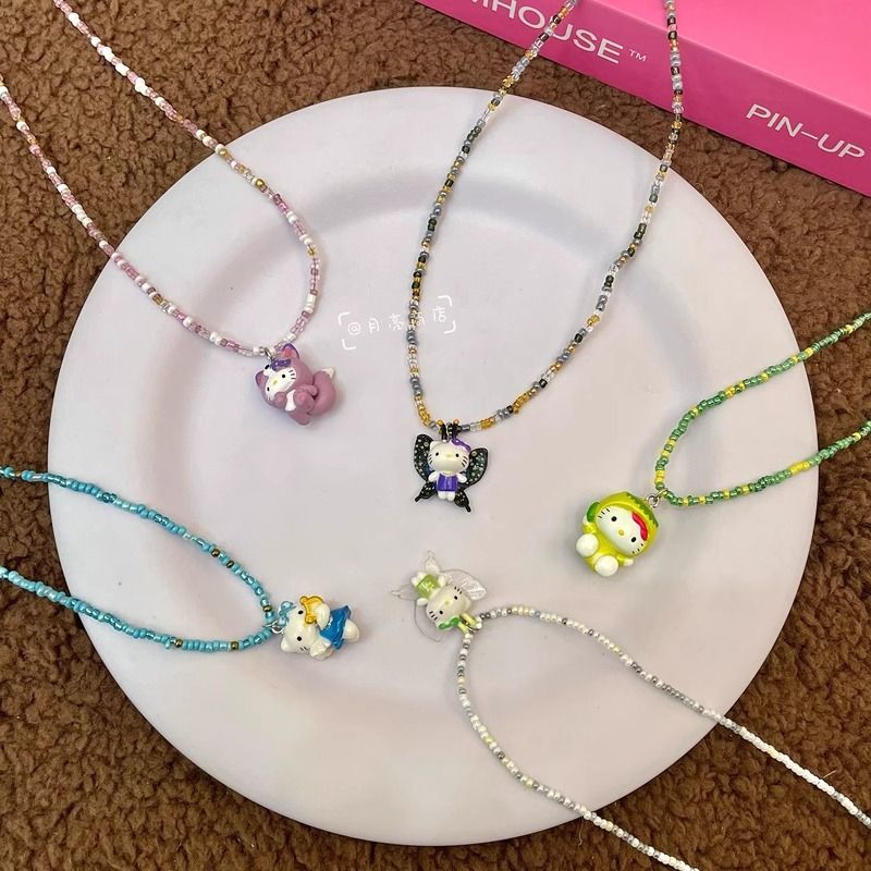春夏彩色小米珠串珠项链辣妹甜美可爱卡通KT猫吊坠锁骨链项饰