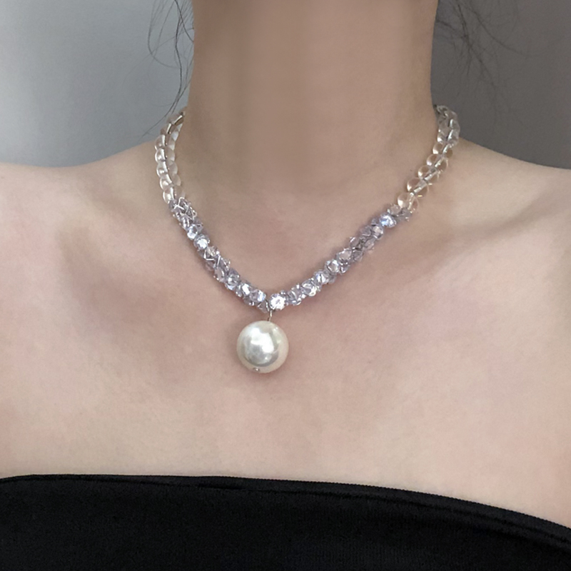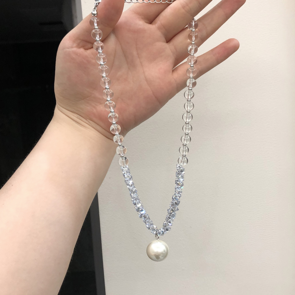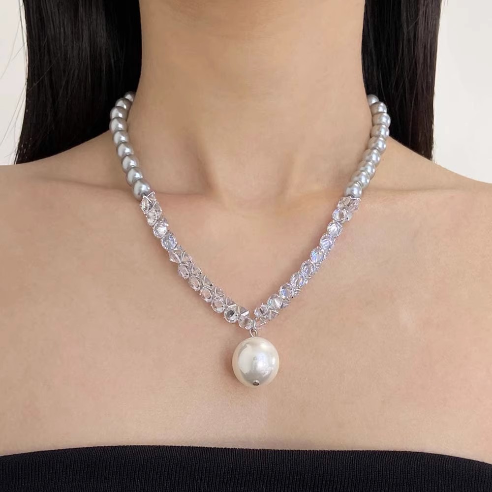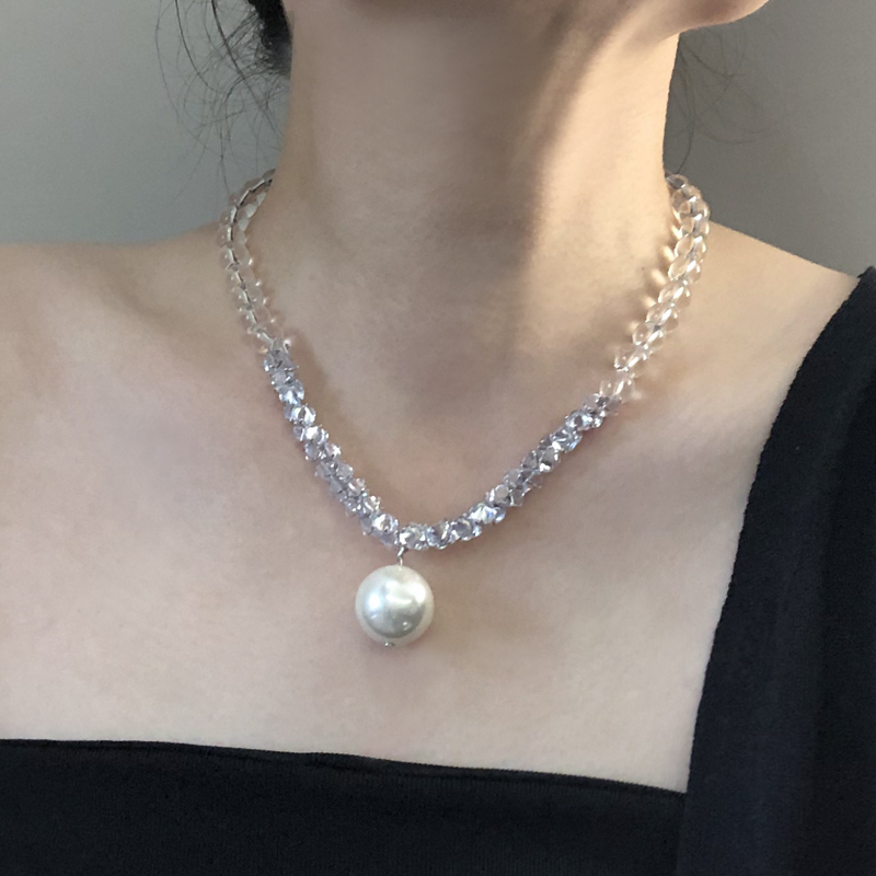 欧美冰透水晶圆珠锆石拼钻吊坠项链女串珠大珍珠设计锁骨链颈链