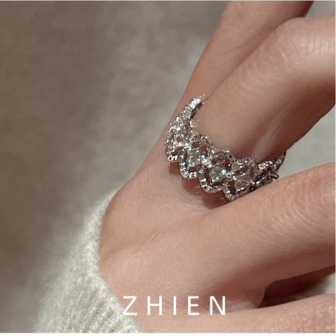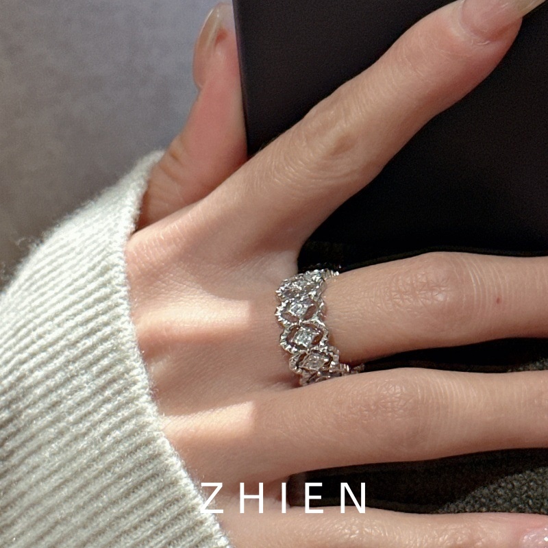 至恩S925纯银戒指女宽版食指蕾丝镂空菱格纹镶钻日韩指环开口银饰