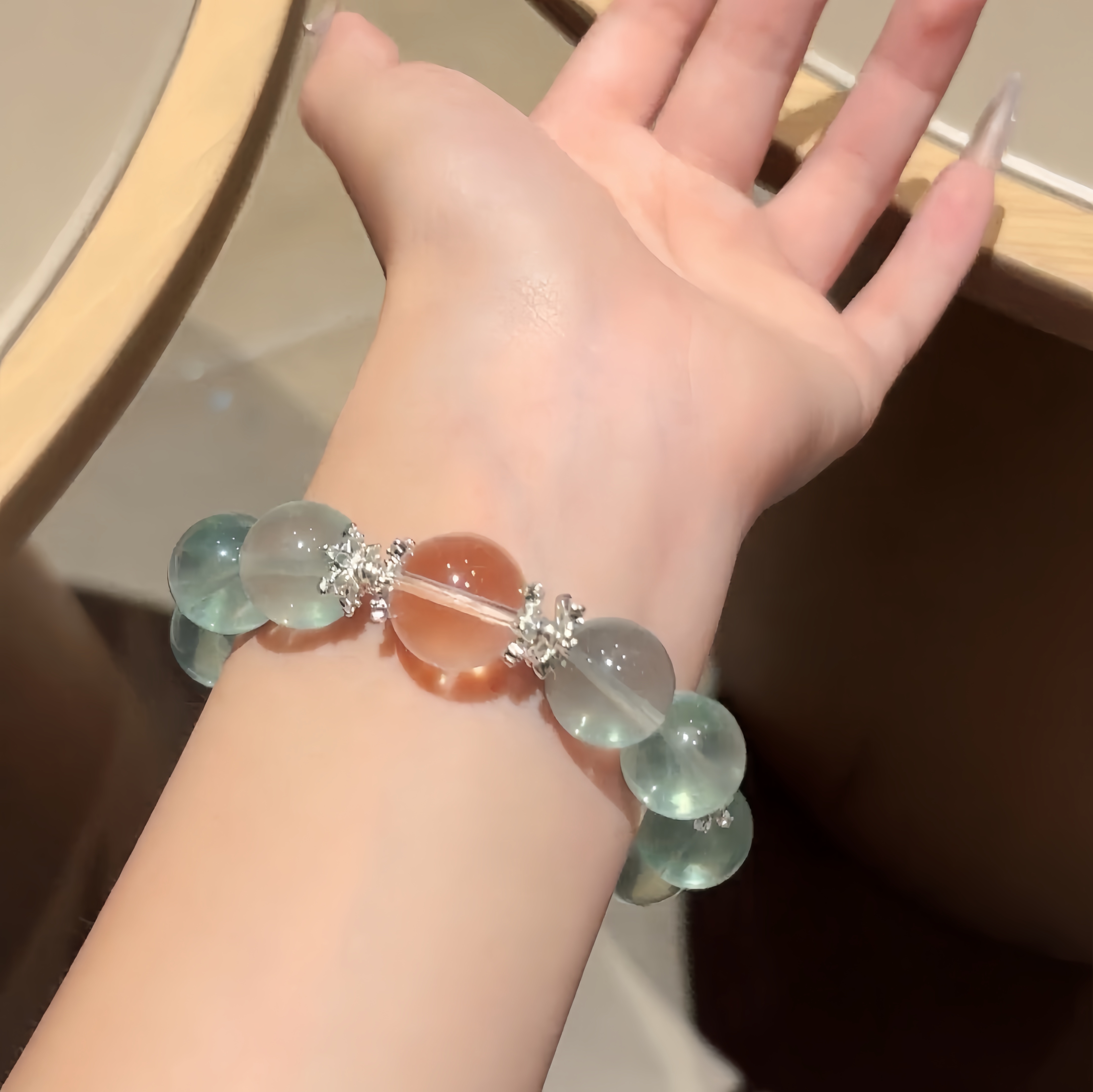天然绿萤石白水晶水晶手链15mm女款时尚百搭饰品礼物送女友闺蜜