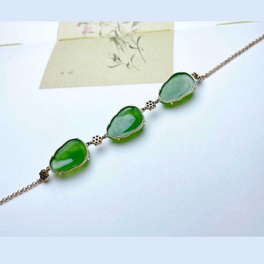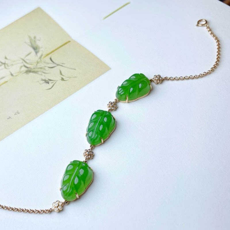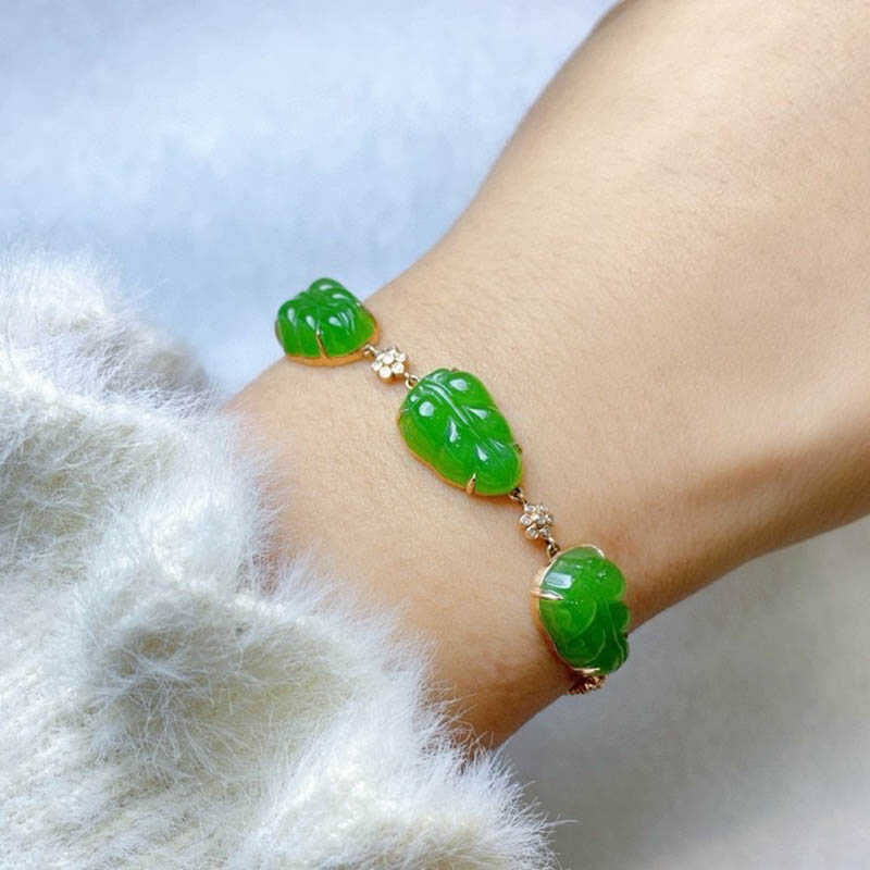 中秋礼物天然和田玉手链苹果绿碧玉叶子镶嵌18K金俄料玉石手饰a货