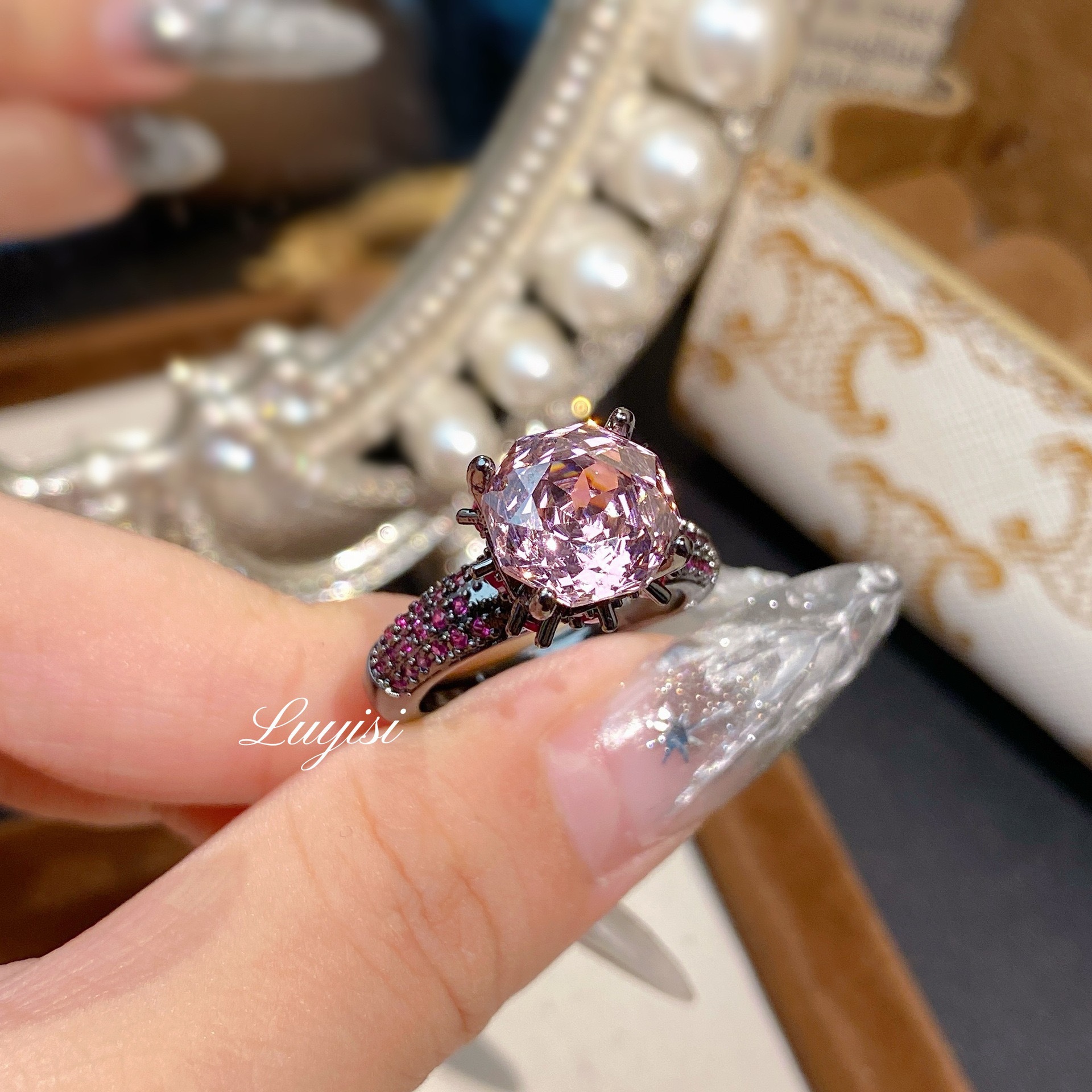 奢华高端八角千禧玫瑰切海蓝戒指女时尚轻奢高碳钻紫钻黑金色指环