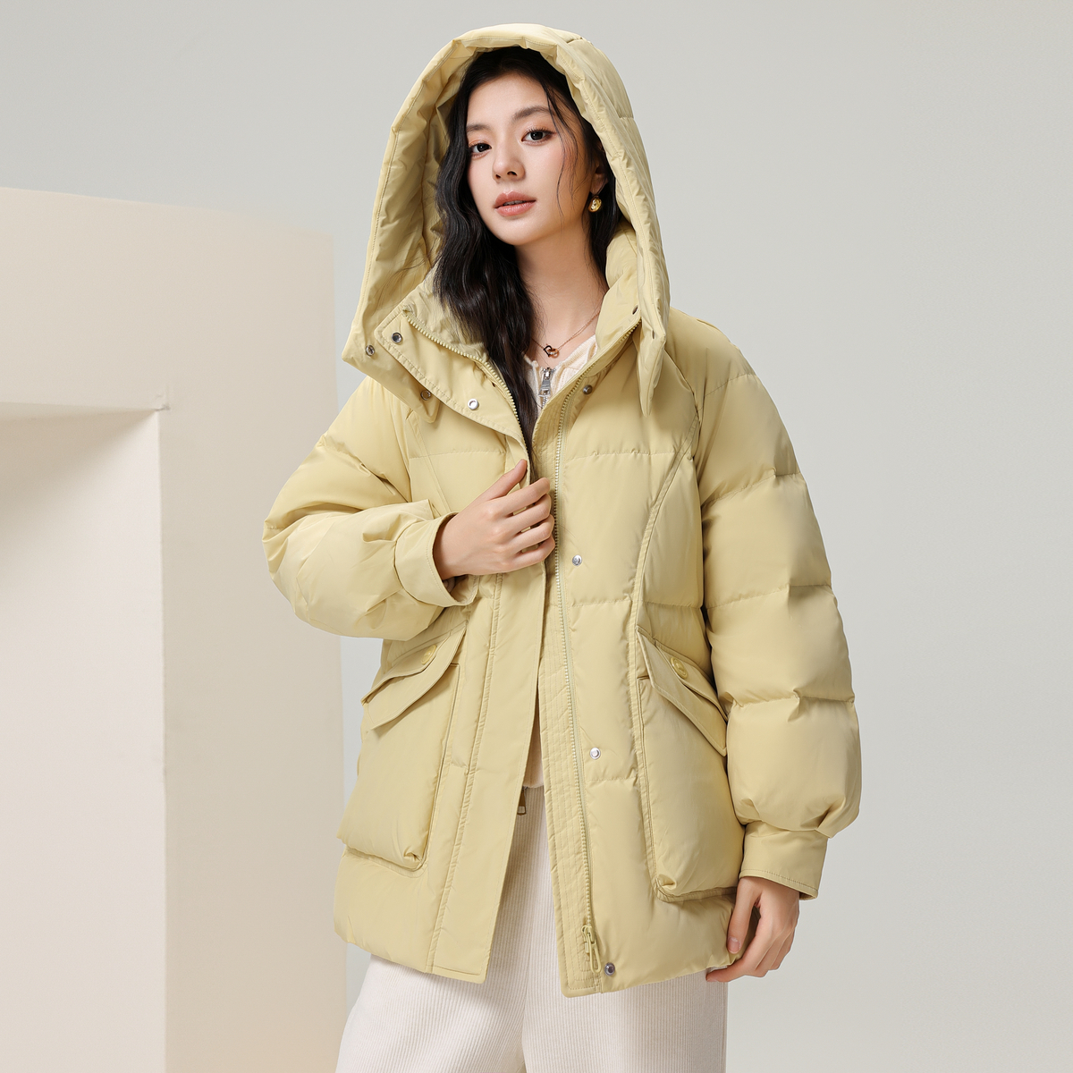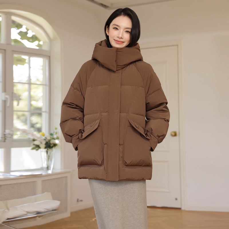 雪中飞2025冬新款女士短款连帽羽绒服加厚插肩宽松廓形时尚简约