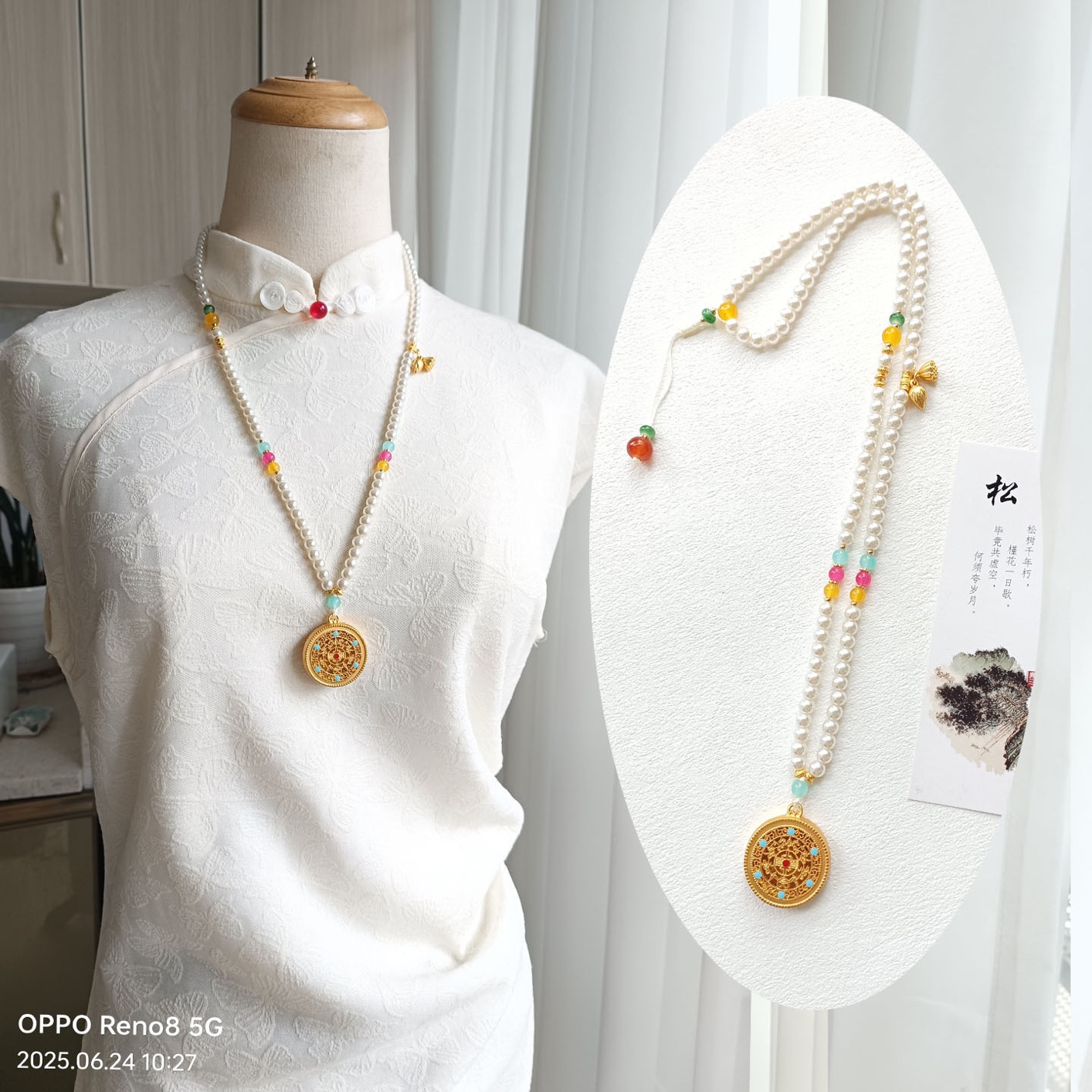 仿珍珠项链新中式圆牌串珠项链马面裙汉服旗袍古风配饰长款毛衣链