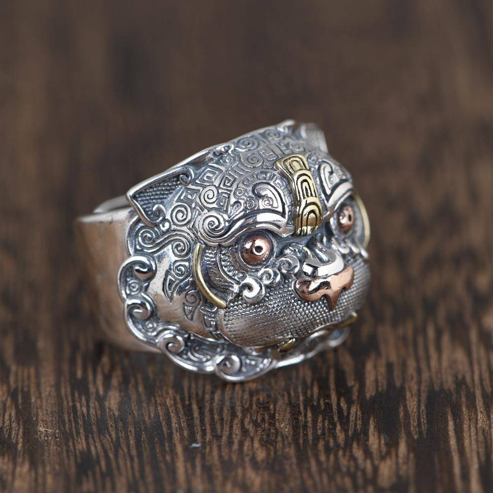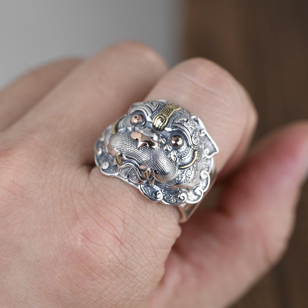 网红-S925银铜结合工艺男款戒指泰银风格开口貔貅食指银指环