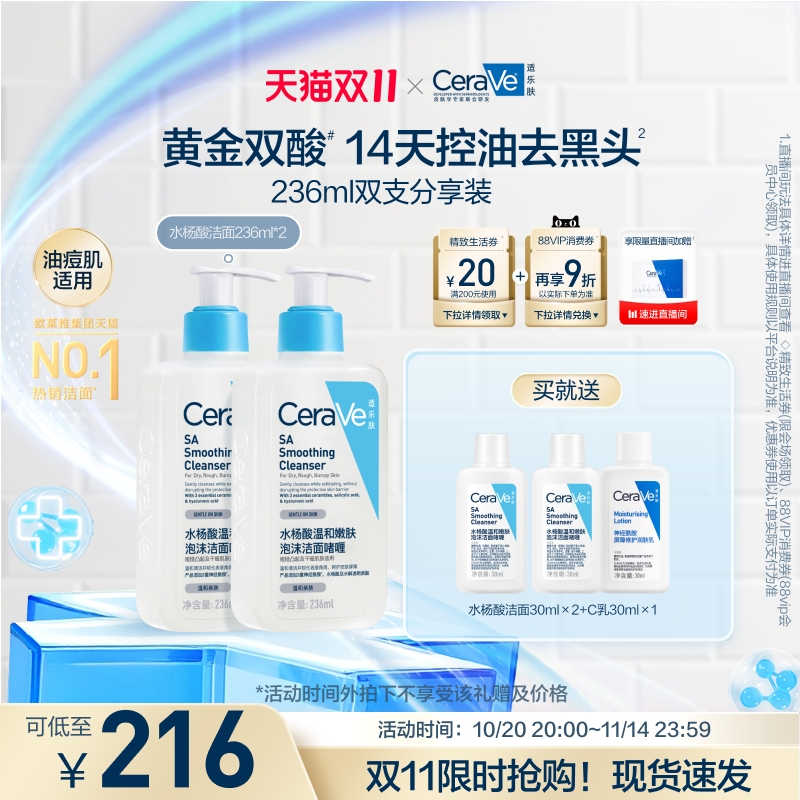 【双11疯抢】CeraVe适乐肤水杨酸氨基酸洗面奶去黑头控油男女士