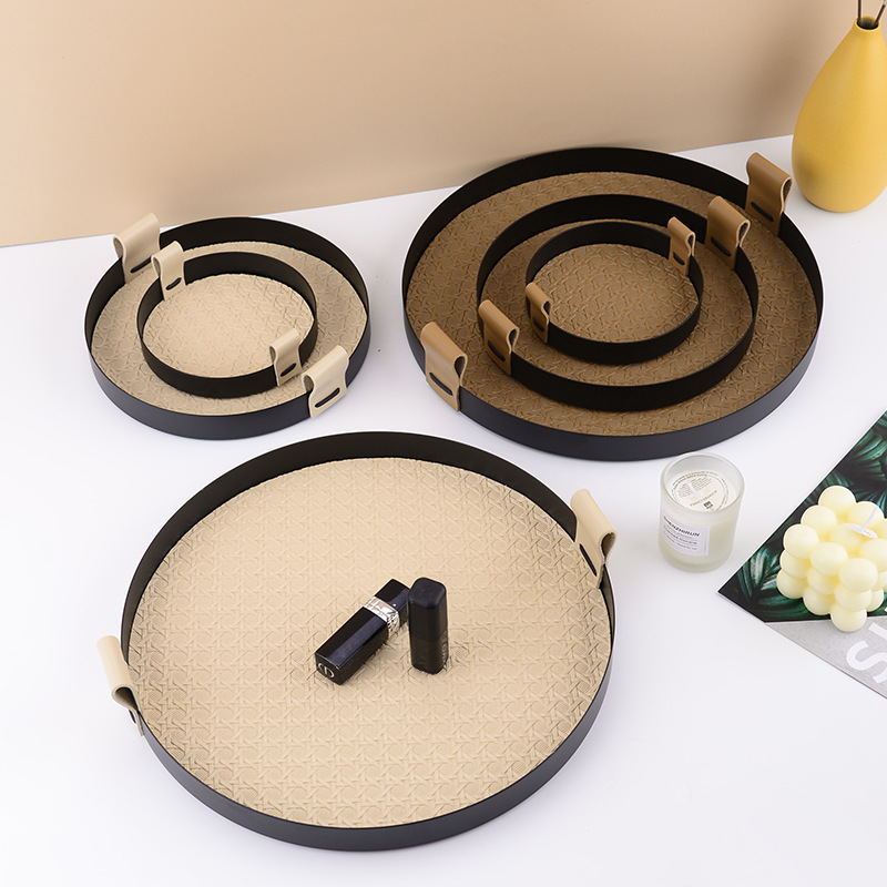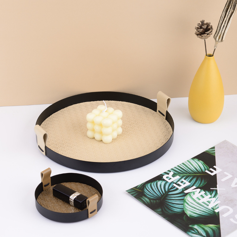 北欧ins风双耳首饰收纳圆盘香薰玄关铁艺置物盘桌面皮革装饰托盘