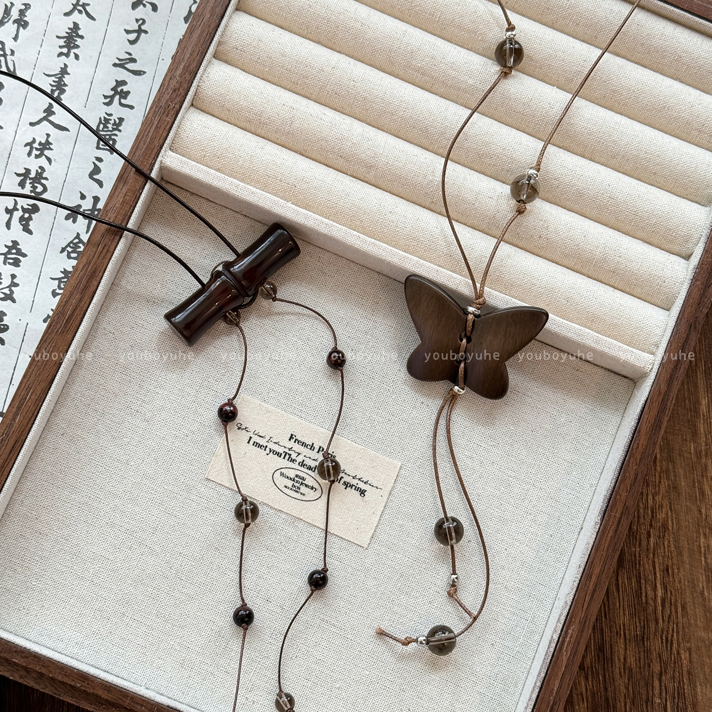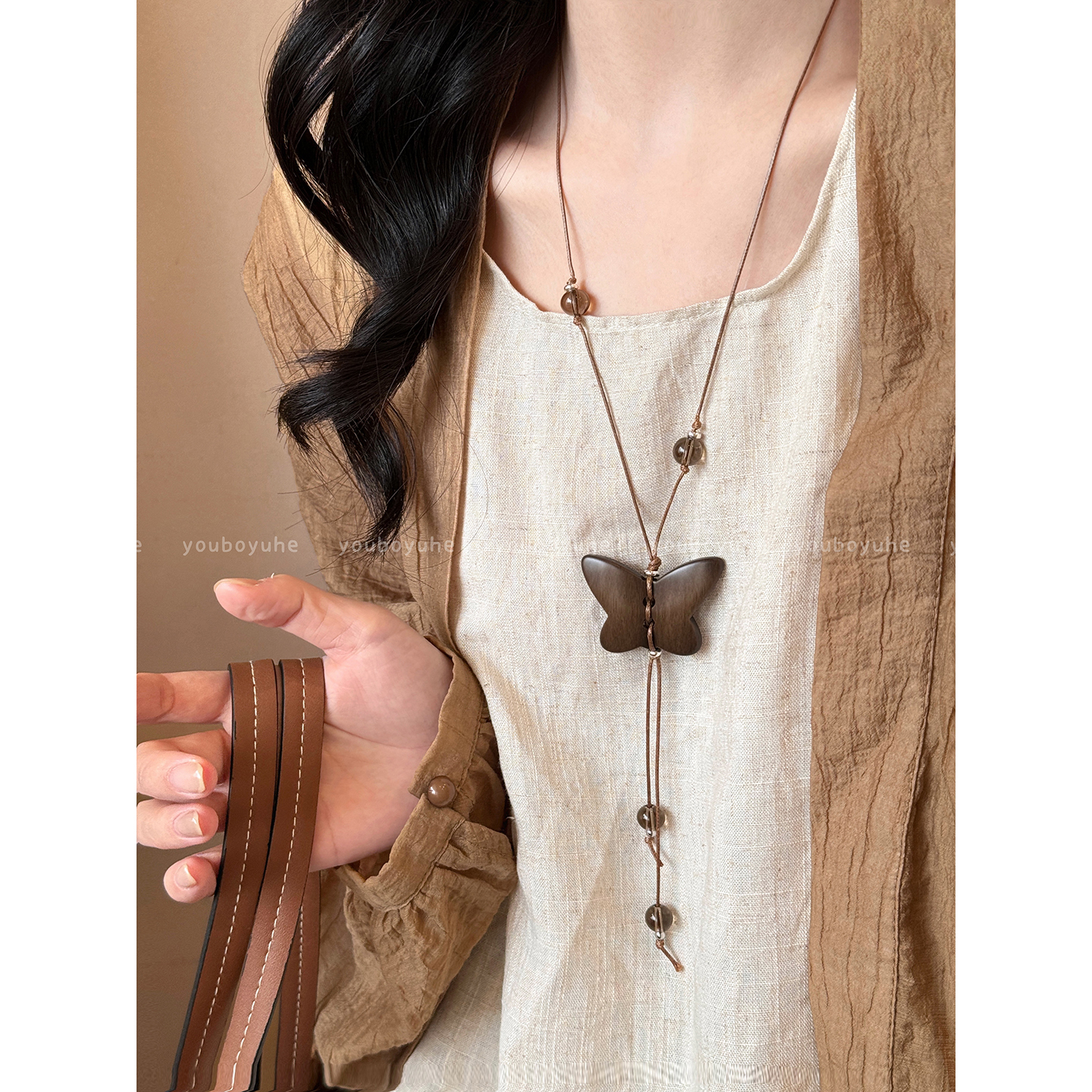 新中式禅意木质蝴蝶项链女小众设计感串珠长款毛衣链日常百搭配饰