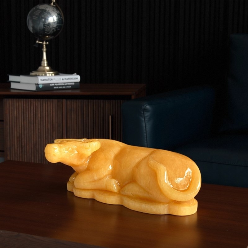 天然米黄玉牛摆件卧牛水牛玉石生肖牛客厅玄关办公室桌面装饰招财