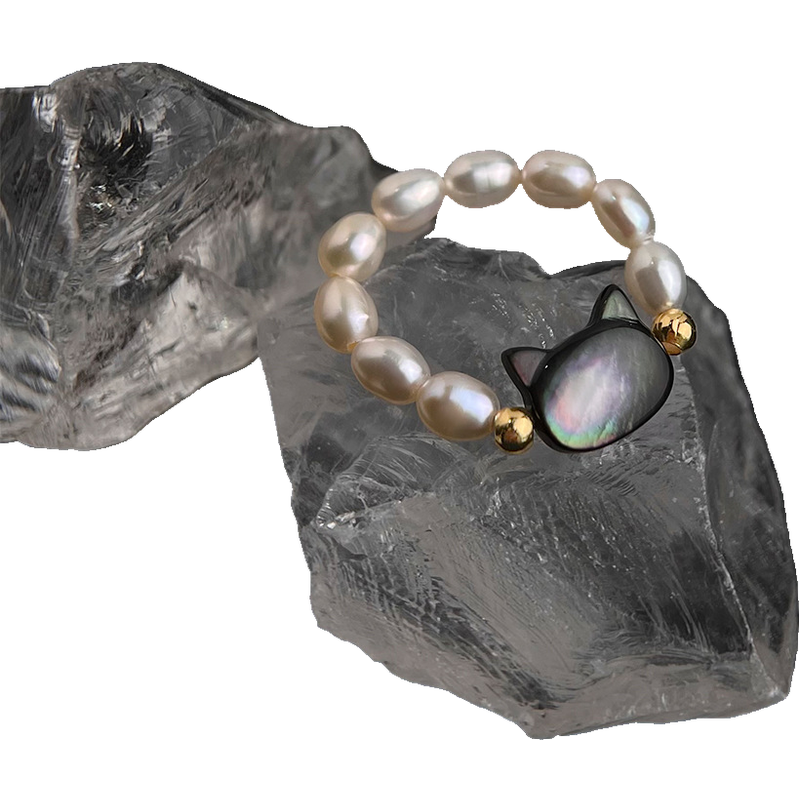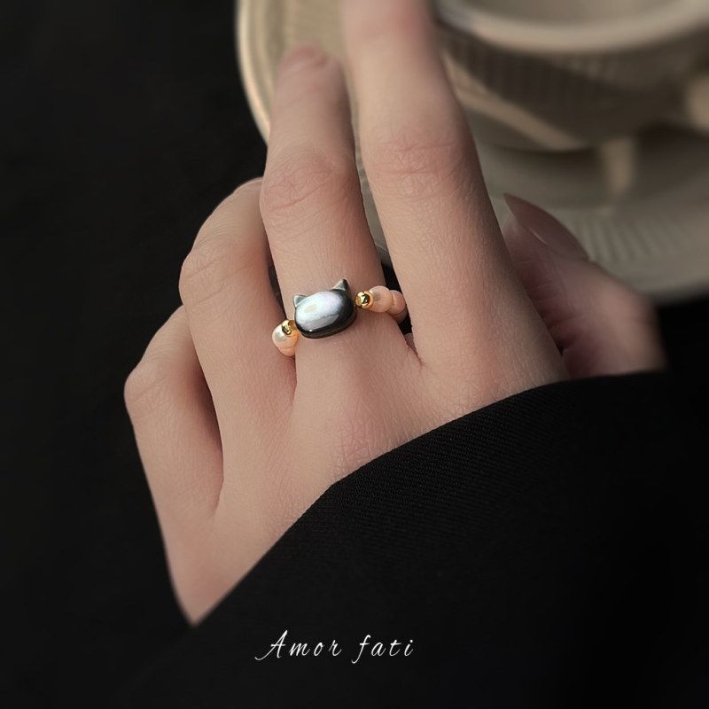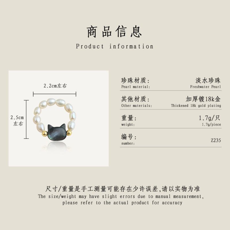 级气质淡水珍珠戒指个性趣味猫咪食指戒感黑蝶母贝指环镀18k金