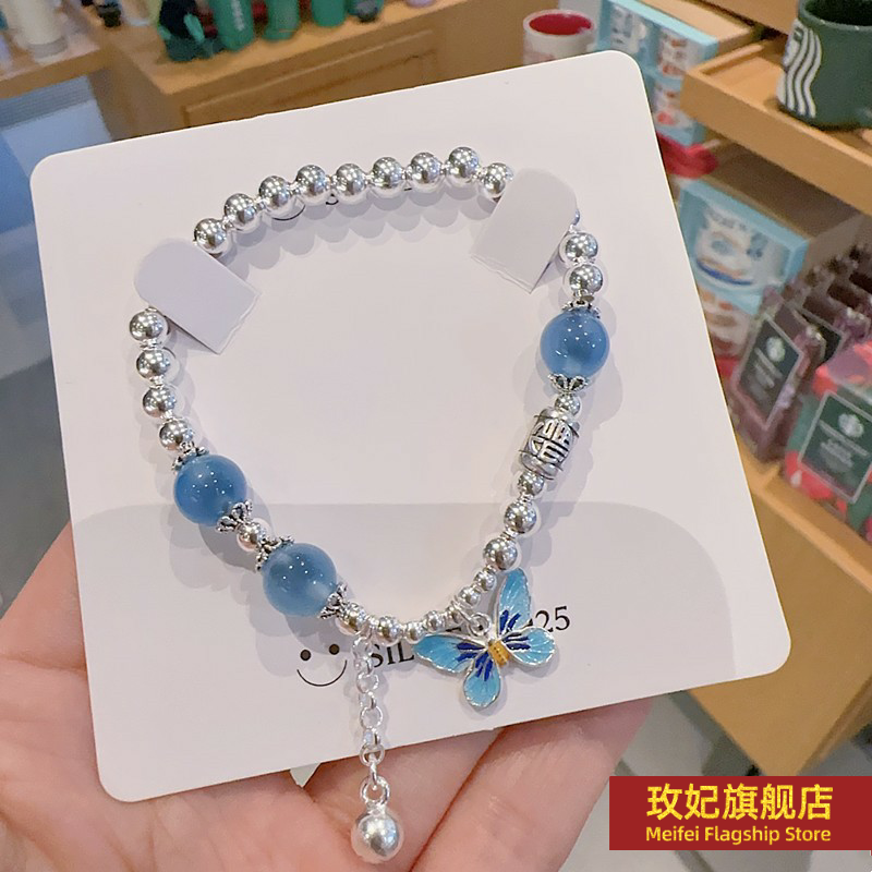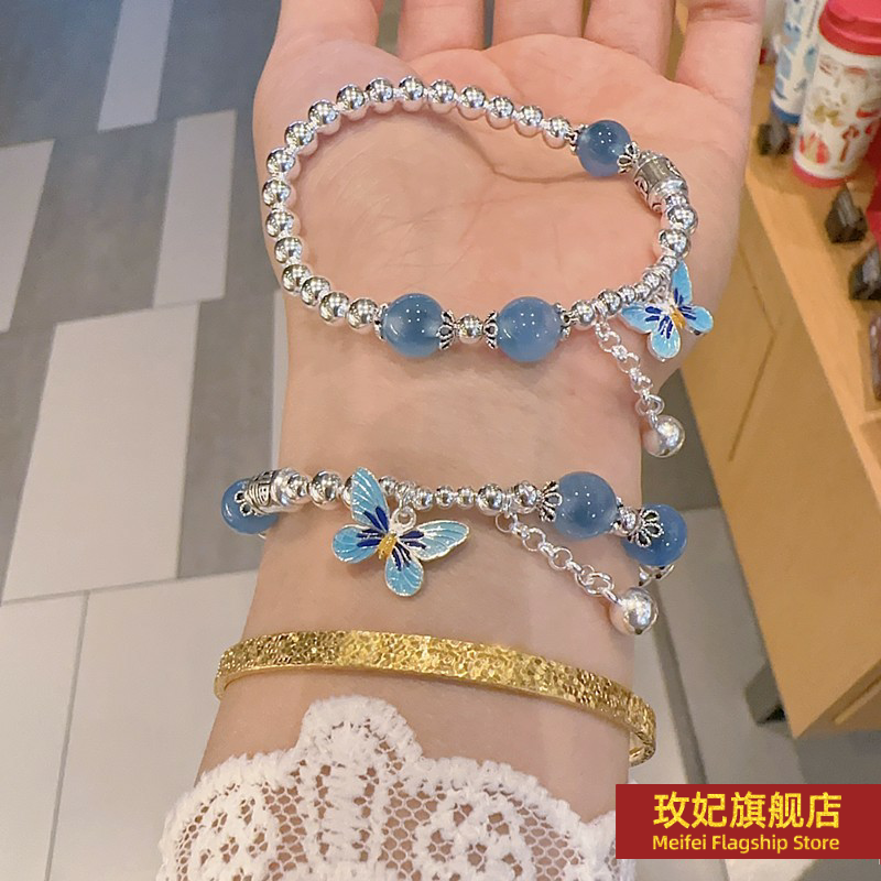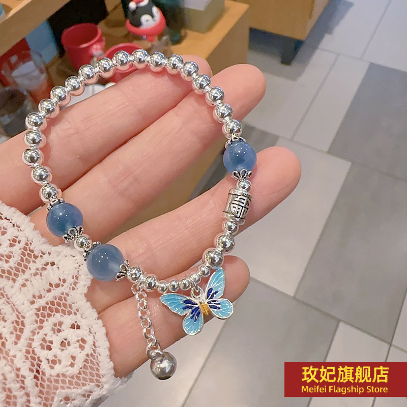 正生纯银天然玛瑙糖心蝴蝶铃铛s925纯银手链女中国风福字珠手串