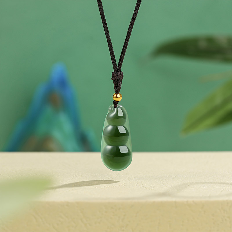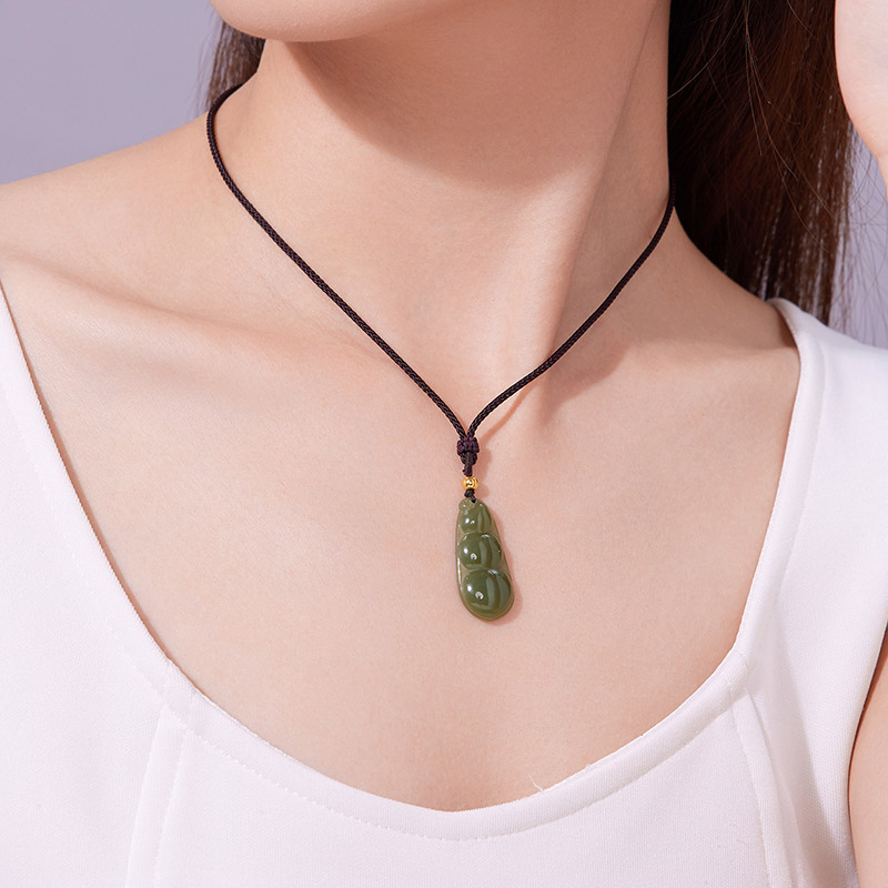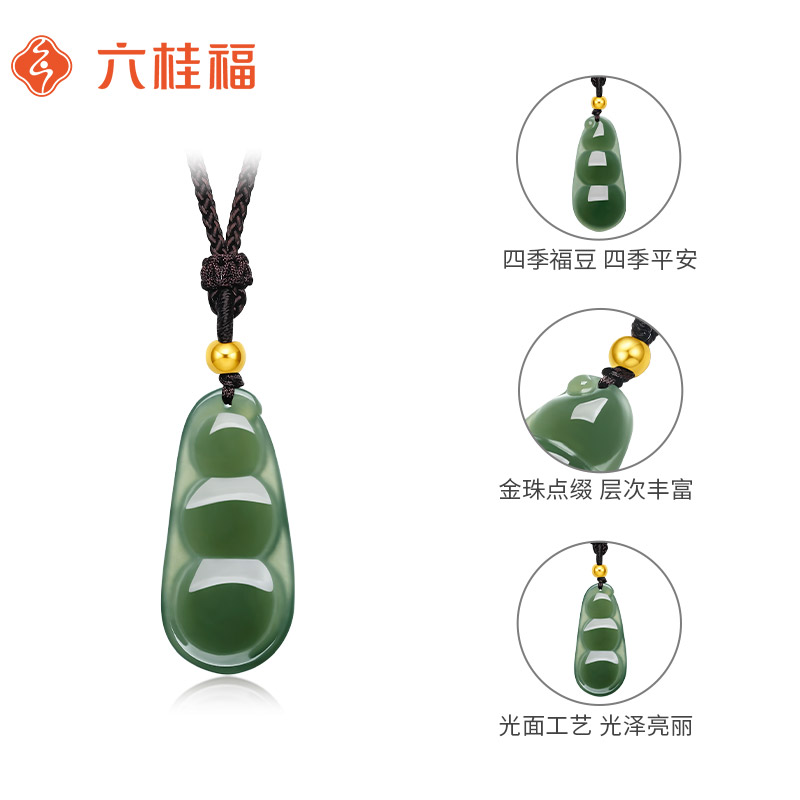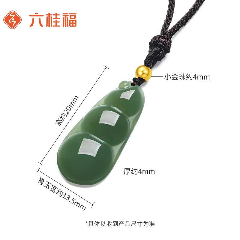 六桂福珠宝黄金小金珠和田玉吊坠男女士款青玉四季豆挂坠编绳挂绳