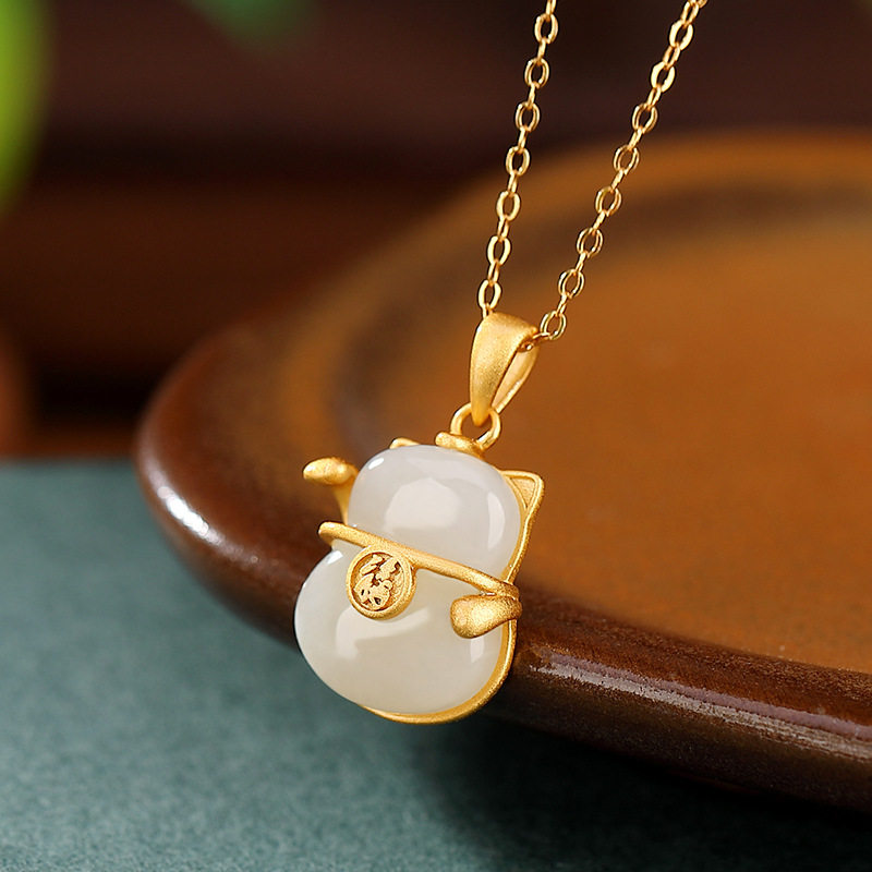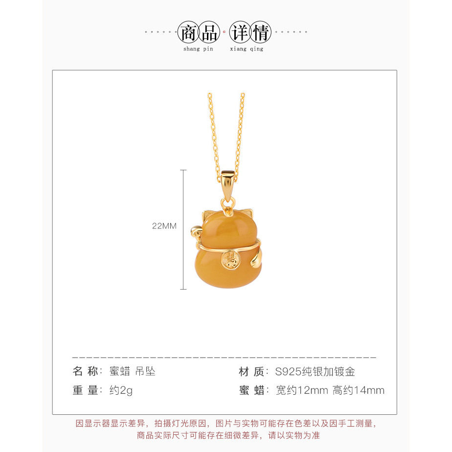 轻奢高级感s925纯银蜜蜡和田玉福字招财猫吊坠小众设计项链配饰女