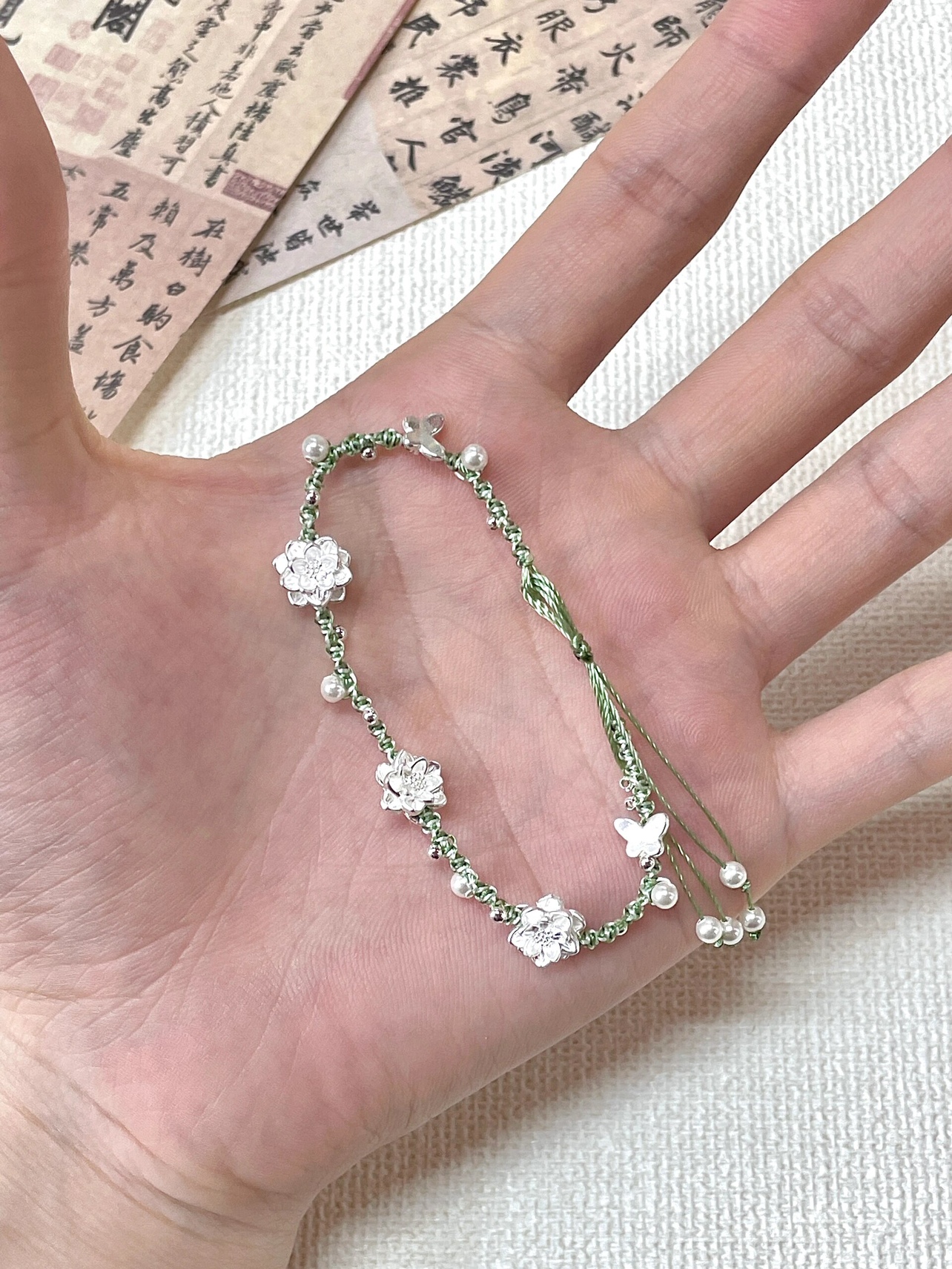 春意绿足银小莲花手链手工编织珍珠莲花手绳简约百搭显白闺蜜手饰