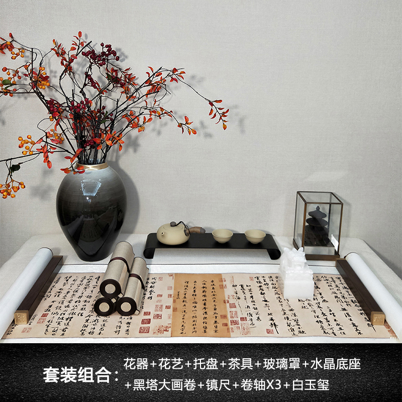 新中式黑灰陶瓷花器摆件组合售楼处书房书桌画卷茶具全案软装摆i.