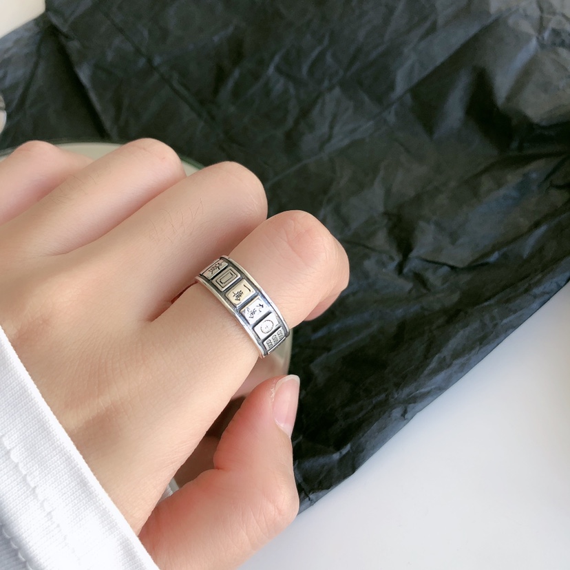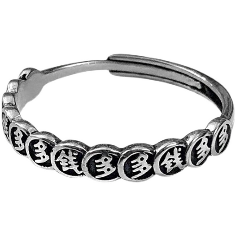 s925纯银钱多多麻将戒指开口可调节网红食指指环复古做旧小众设计