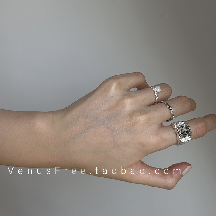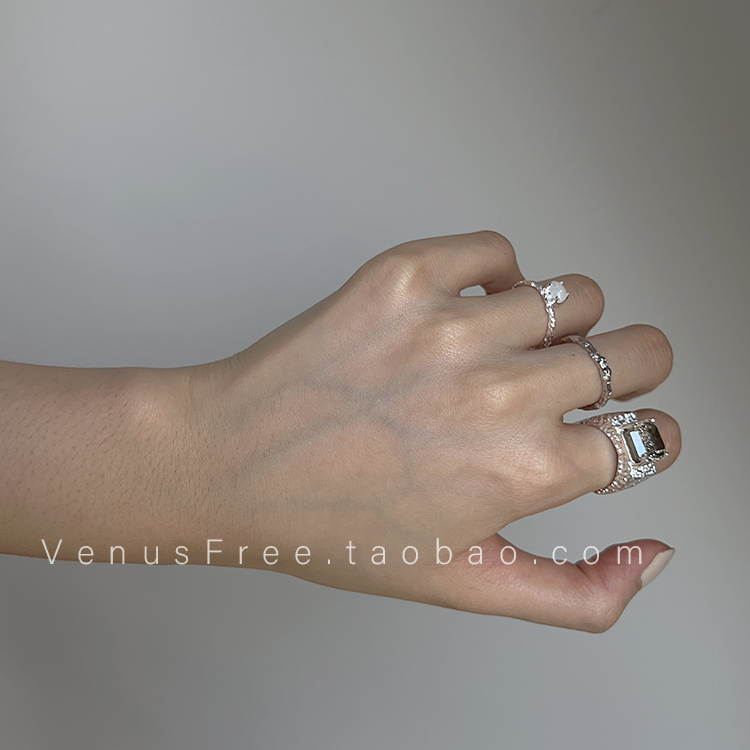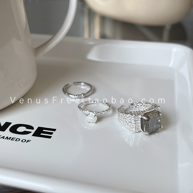 3选冷淡风925纯银透灰色大颗水晶纹理异形欧泊石细戒指环开口叠戴
