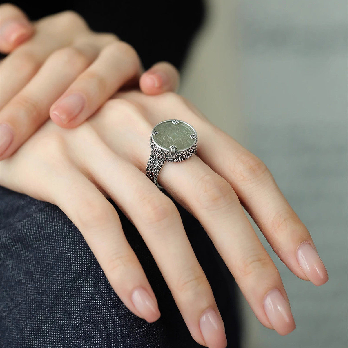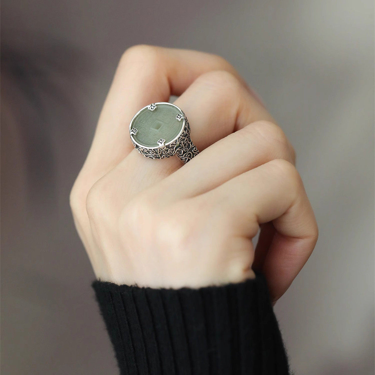 925银和田玉山鬼祥云做旧戒指可调节文艺新中式小众复古饰品礼物