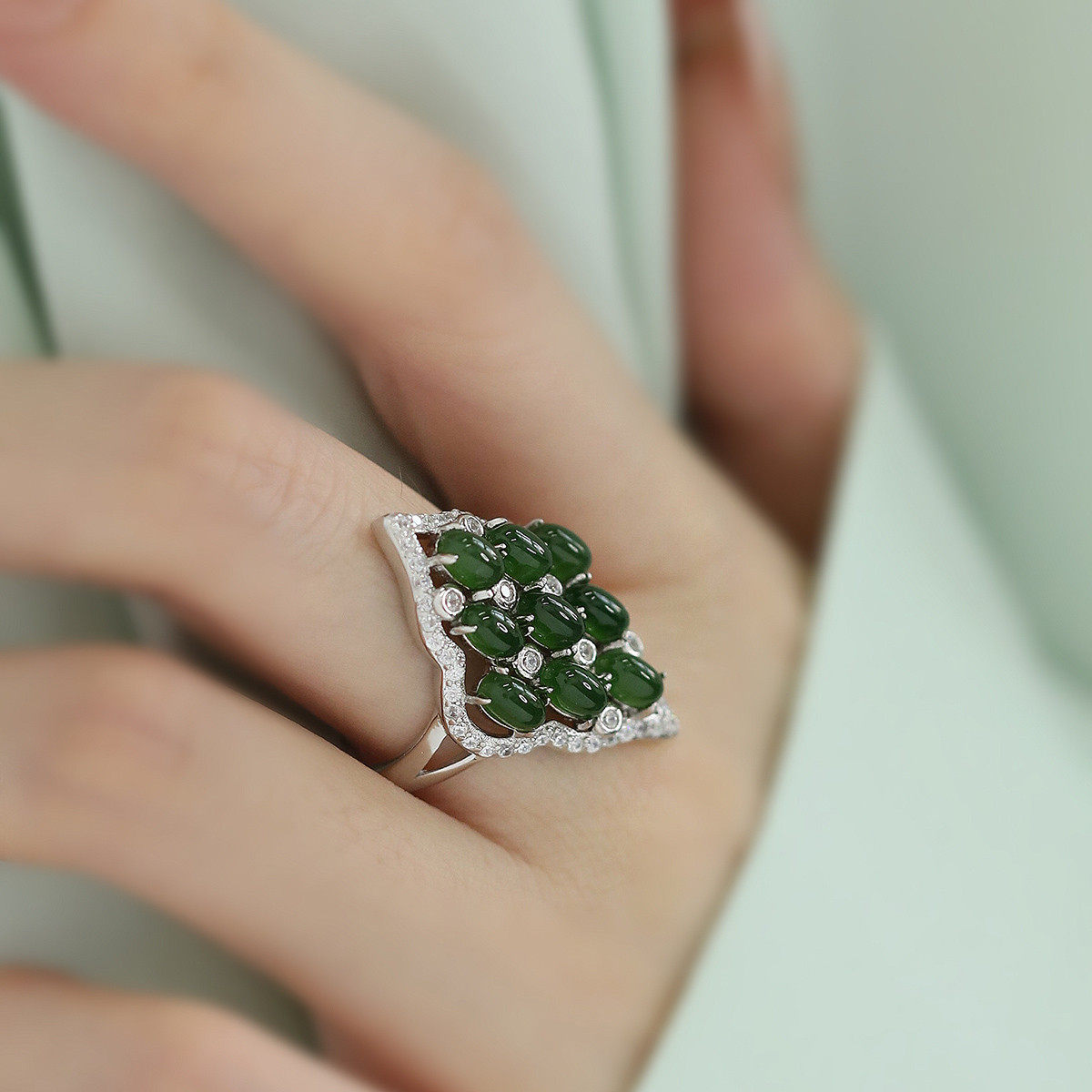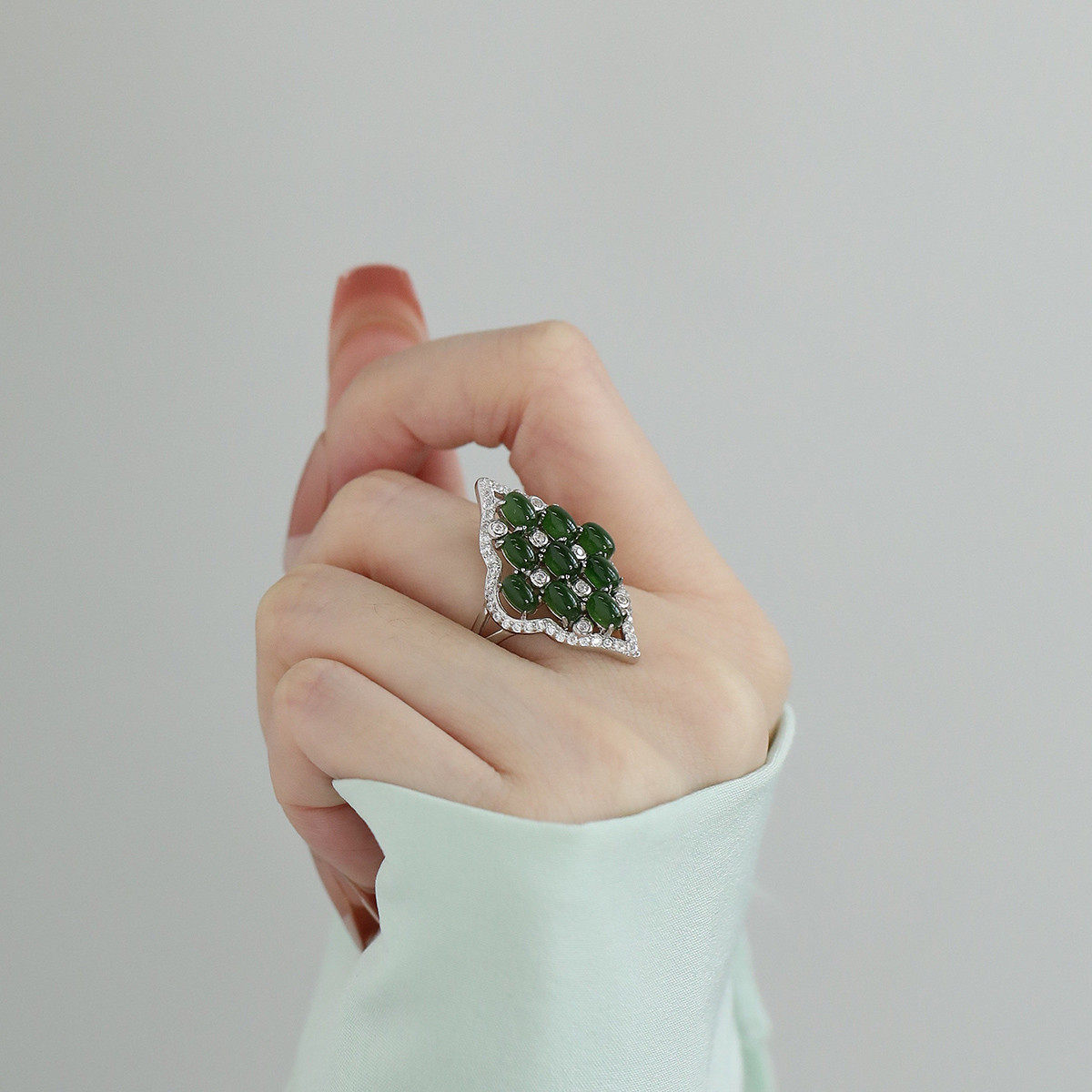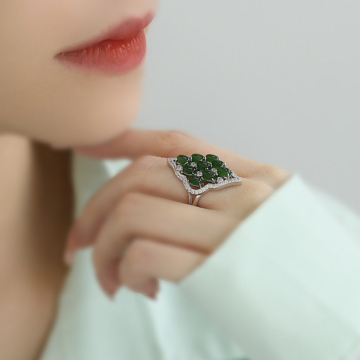 925纯银和田玉碧玉菱形戒指2024年指环可调节百搭复古民族风饰品