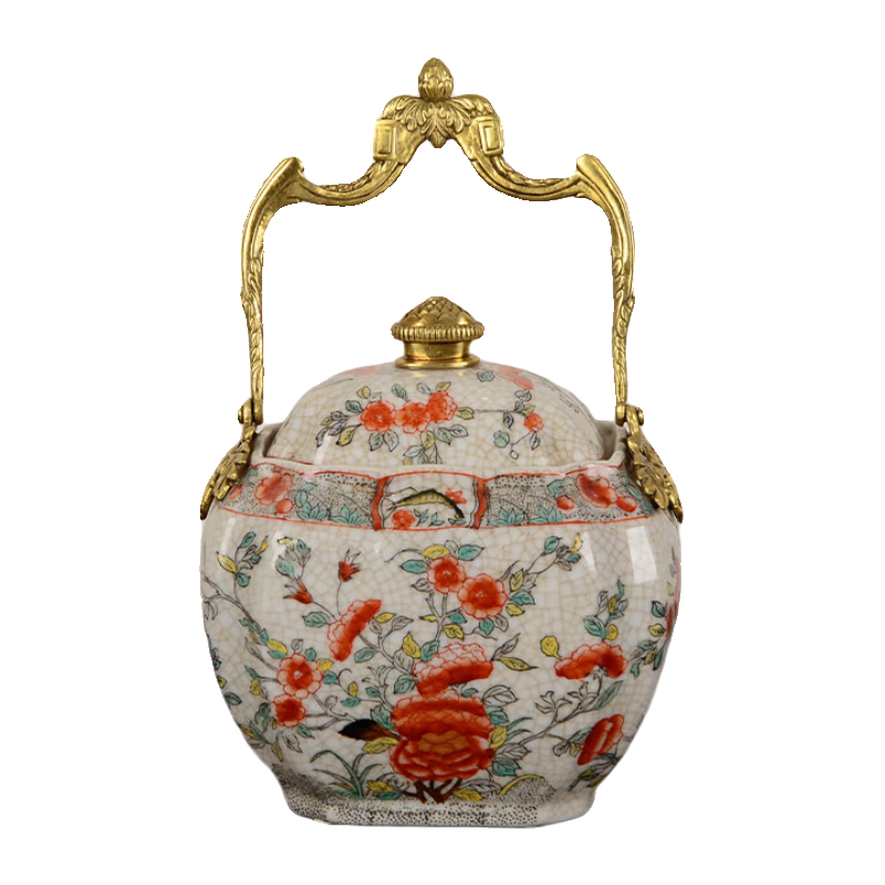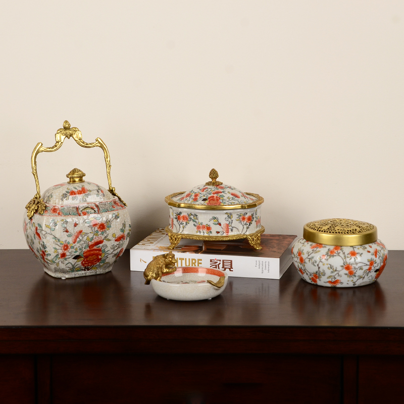 美式铜配陶瓷手绘花卉提壶储物罐家居客厅干果糖果装饰罐客厅摆件