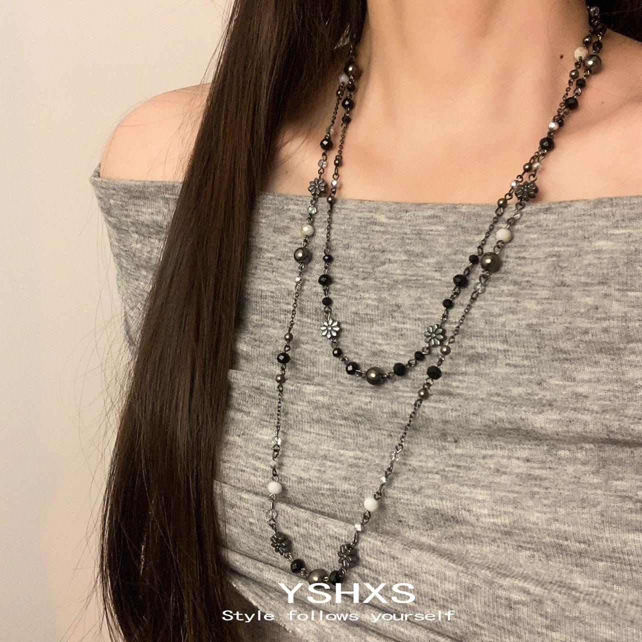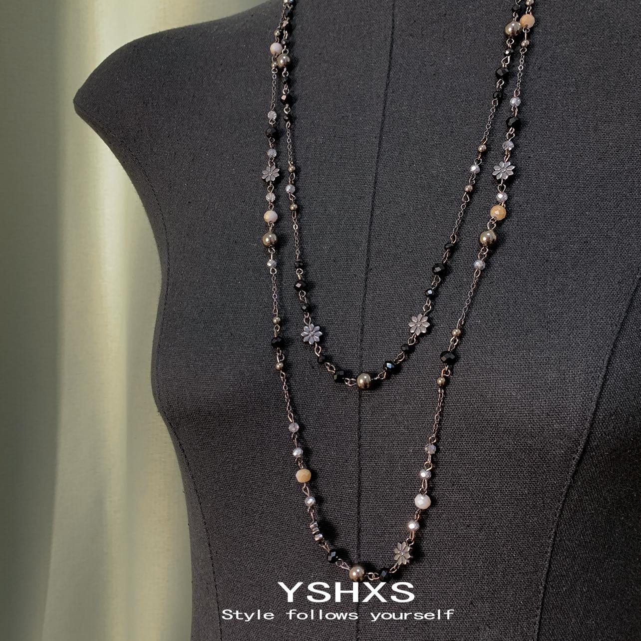 复古做旧花朵串珠长款项链甜酷辣妹双层叠戴波西米亚民族风毛衣链