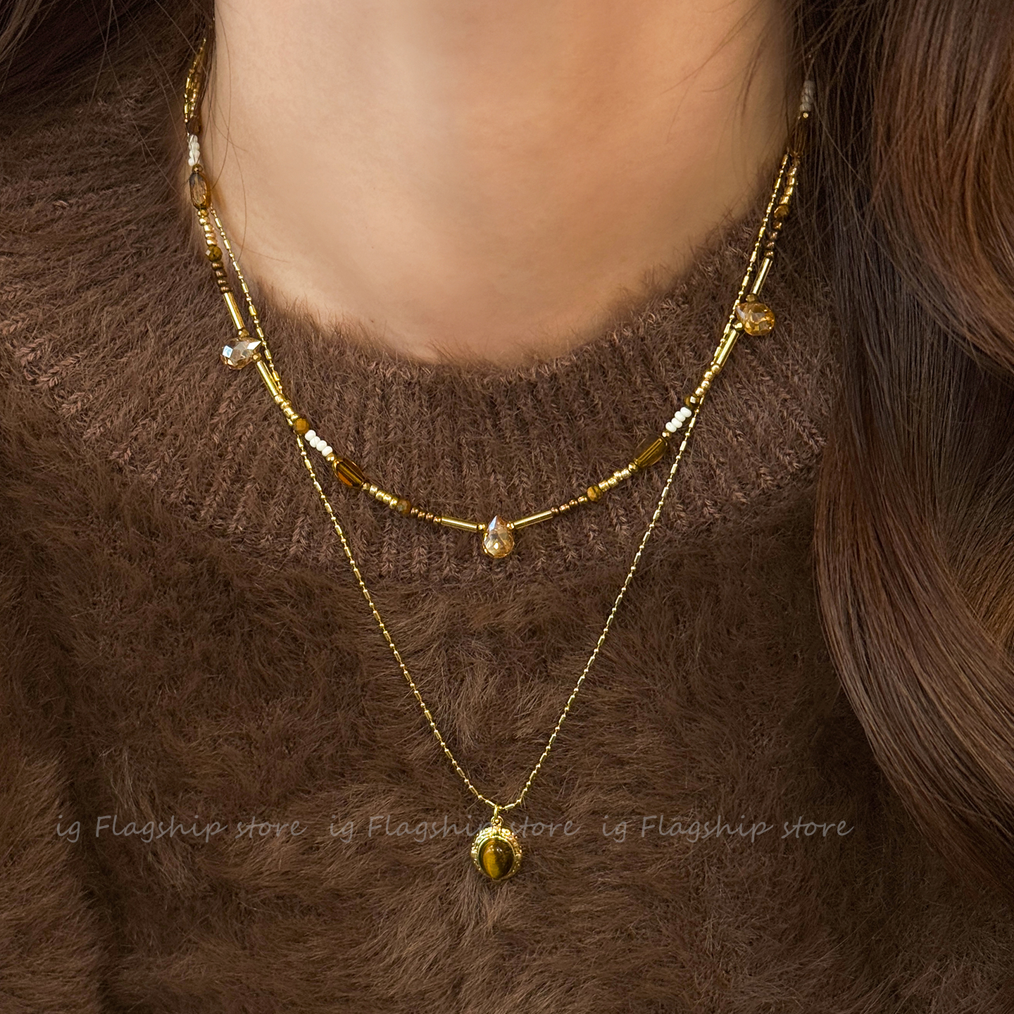 美拉德风~项链女虎眼石吊坠串珠毛衣链颈链2025新款小众叠戴配饰