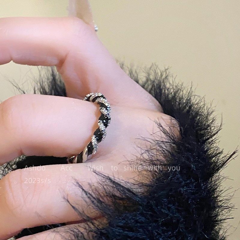 冷淡风黑色滴釉开口缠绕戒指锆石气质精致感素圈小众设计感指环女