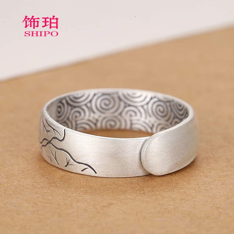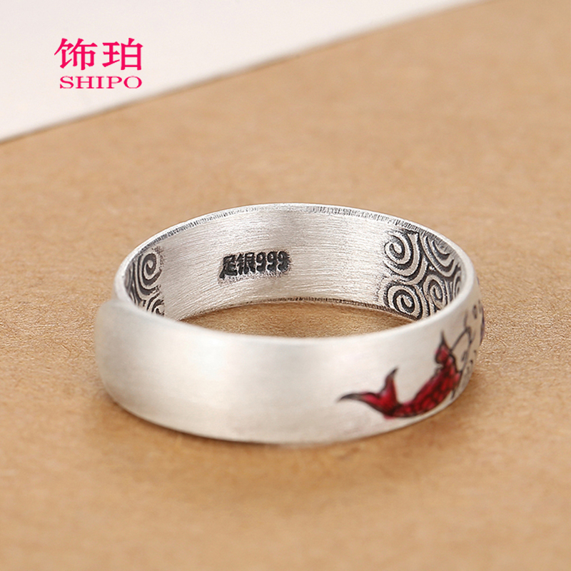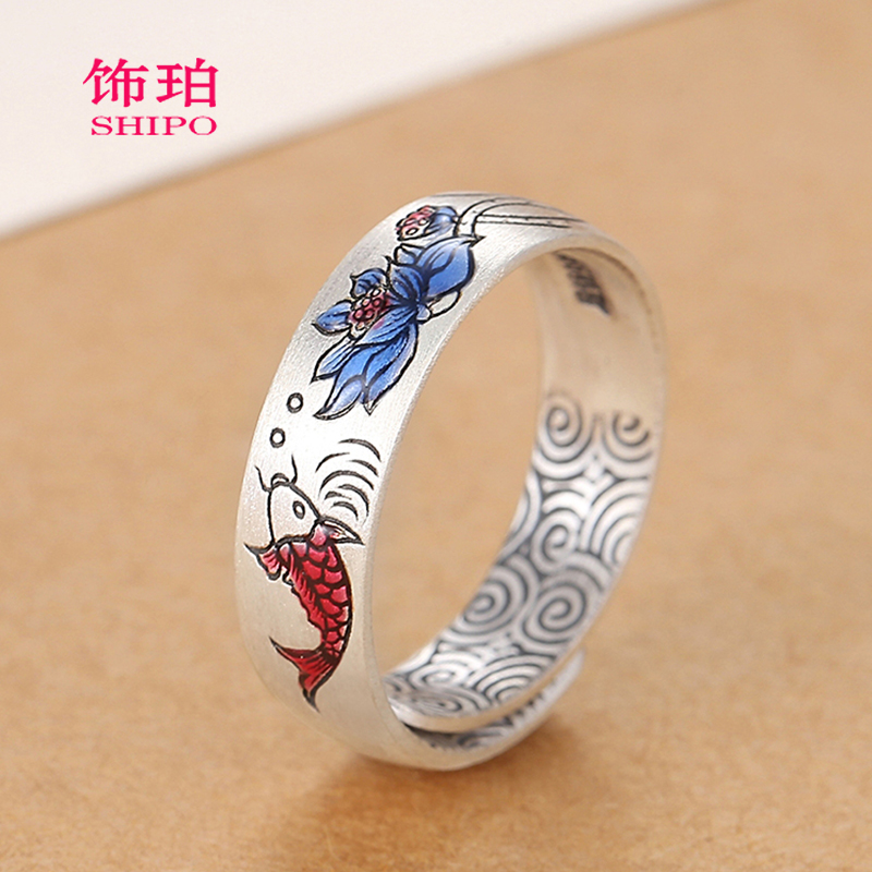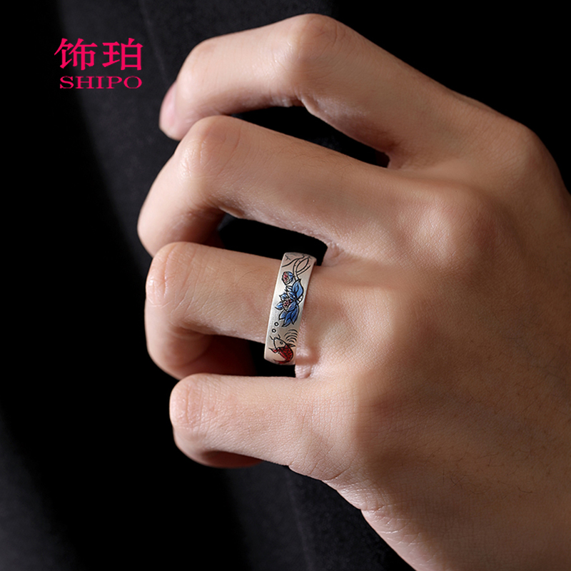 999足银锦鲤荷花男女士戒指纯银开口可调节小众国风潮男款食指环