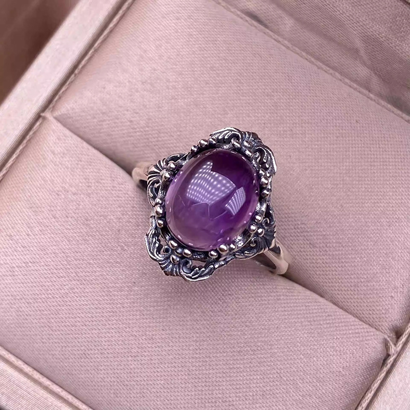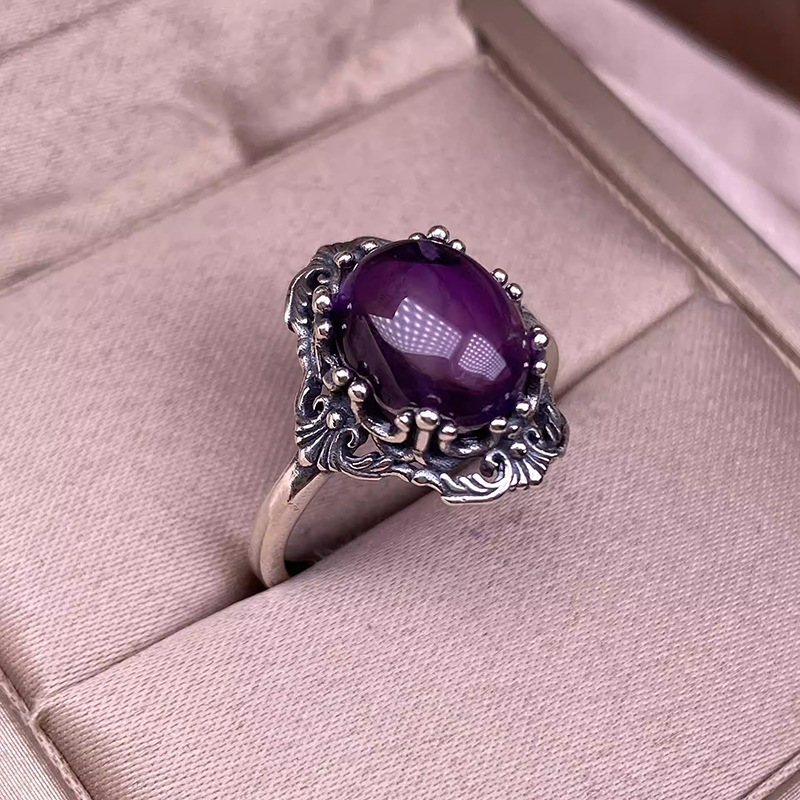 镶嵌紫水晶戒指复古做旧尼泊尔花边男女同款彩宝水晶