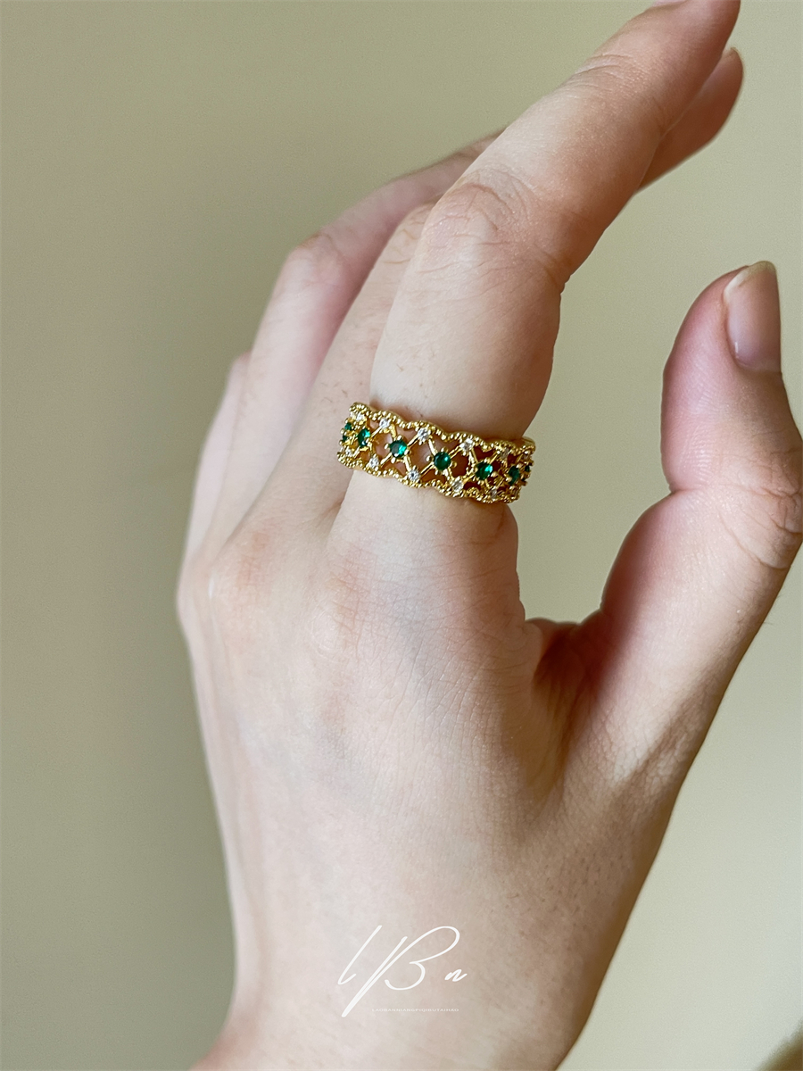 复古高级感!法式祖母绿微镶锆石花朵镂空蕾丝小众金属戒指12959