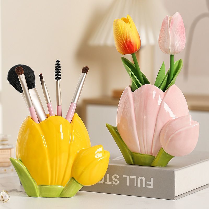 郁金香笔筒创意化妆刷文具收纳陶瓷花朵摆件办公室桌面宿舍置物桶