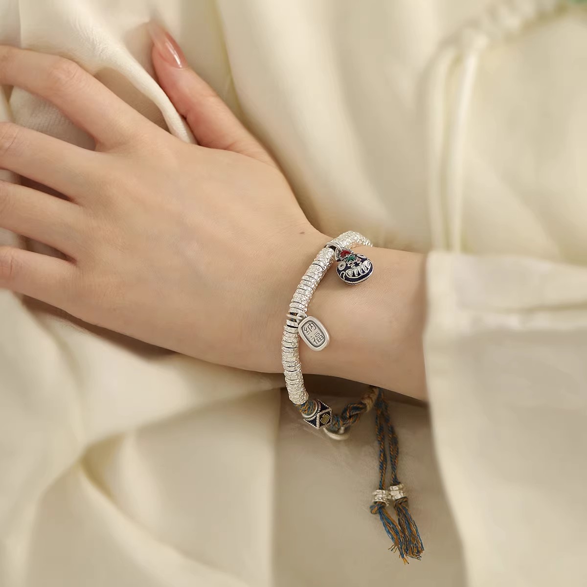 925银复古新中式圆形盘缠招财吞金兽手链编织手绳女士简约高级感