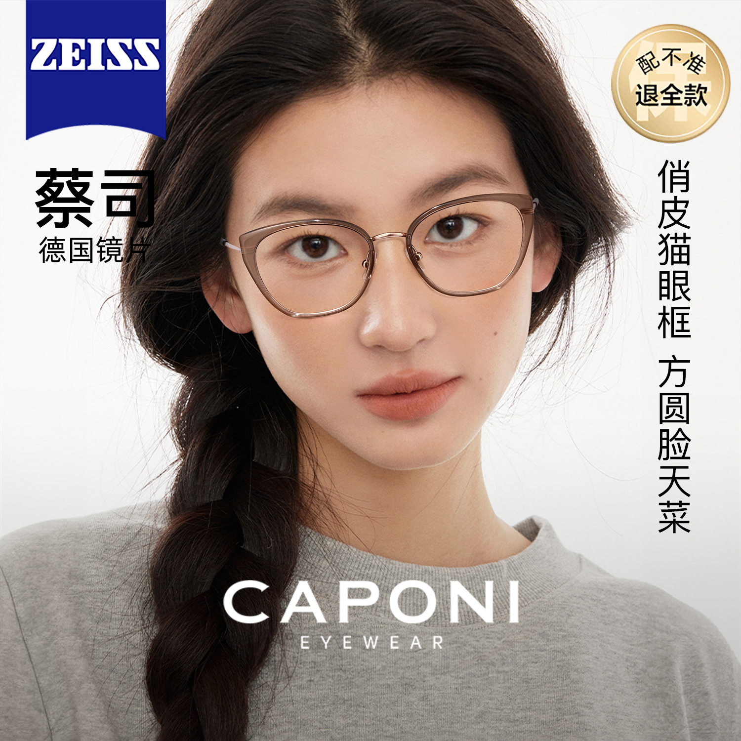 CAPONI猫眼眼镜女方圆脸冷茶色素颜眼镜框近视可配度数防蓝光蔡司