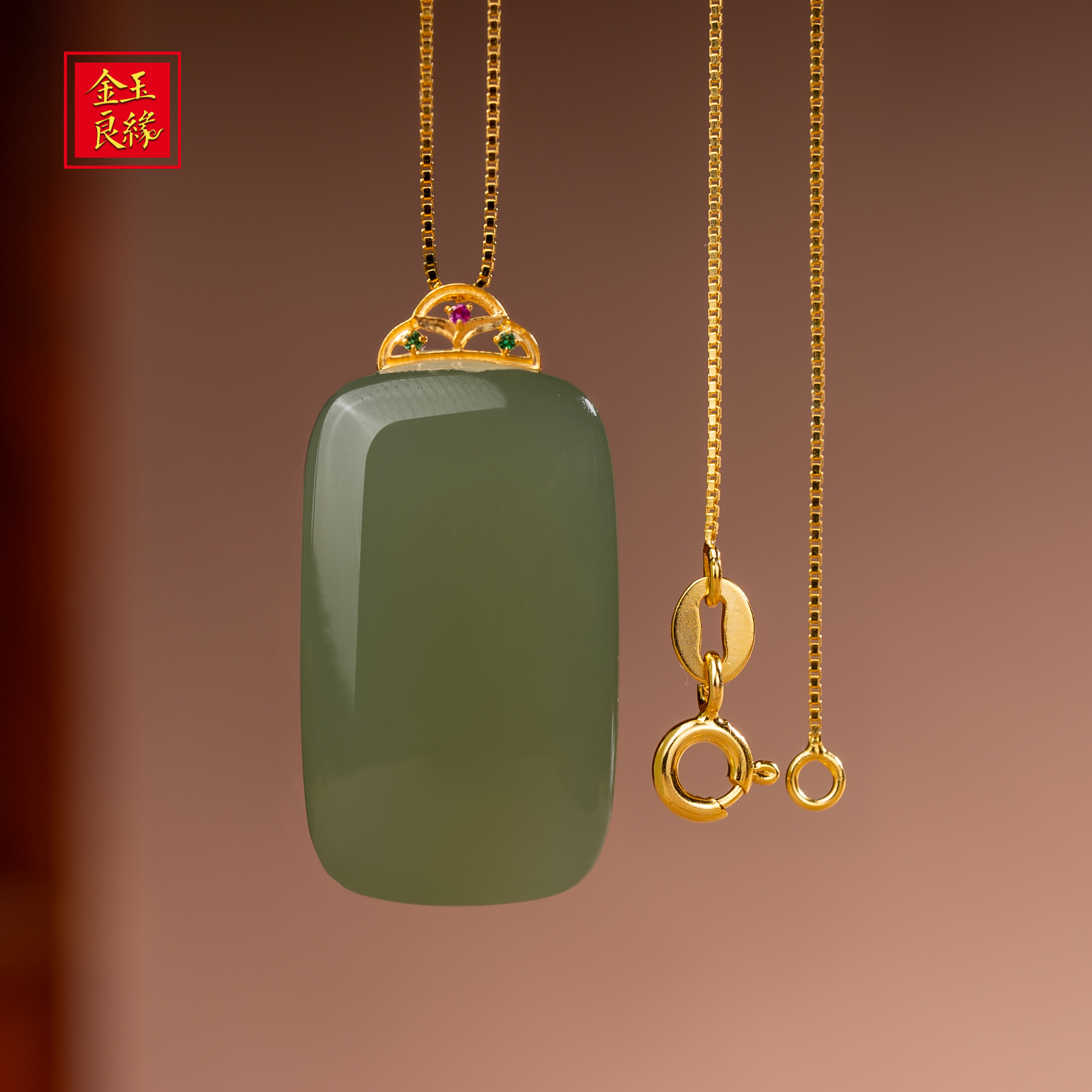 金玉良缘【雅安】18K金湖水绿天然和田玉无事牌吊坠项链礼物