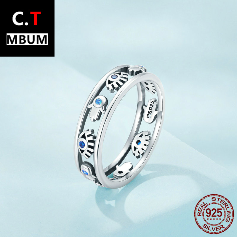 饰品跨境纯银s925恶魔之眼镂空号戒指蓝色锆石法蒂玛之手排列指环