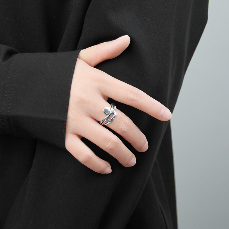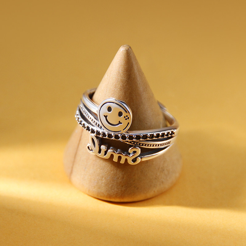 纯银戒指女字母笑脸设计复古时尚中食指戒子新款指环精致高级感潮